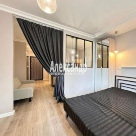 1700252 Сдаётся отличная студия в ЖК "Ландрин". Есть всё необходимое для жизни: сама комната разделена для удобства проживания оригинальной дизайнерской перегородкой.В спальной зоне большая широкая кровать с двумя зеркальным шкафами и выходом на уютную лоджию, в кухонной...