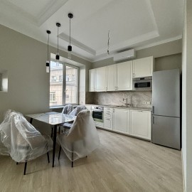 БЕЗ КОМИССИИ Квартира с дизайнерским ремонтом и европланировкой в ЖК Skandi Klubb. Квартира: Дизайнерский проект под ключ от Qasabo. Оборудована мебелью и техникой. Много света и пространства за счет открытой планировки, светлых тонов и больших окон. Система рекуперации...