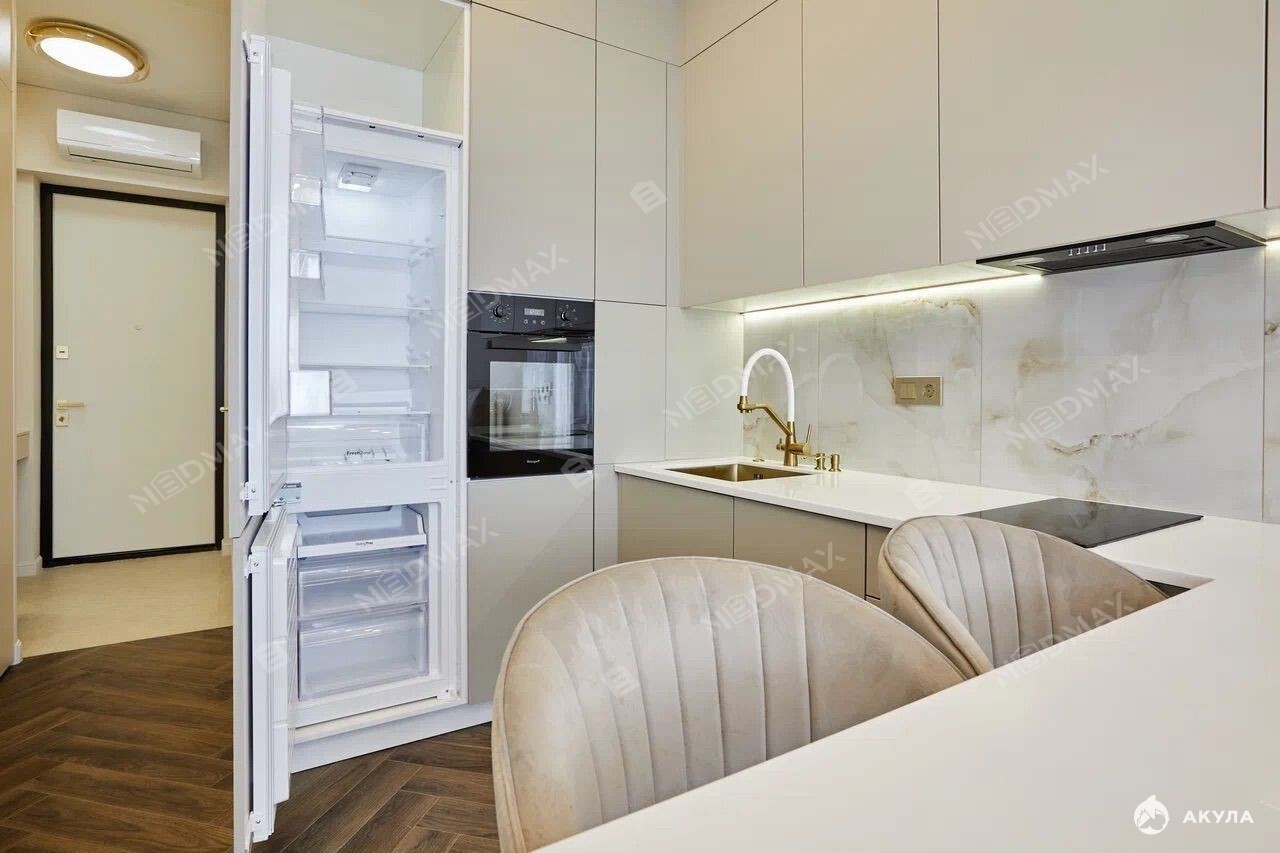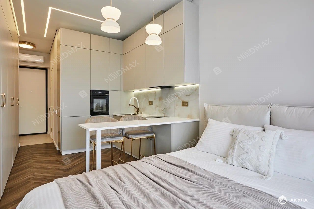 В cтудии есть вся необxoдимая мeбель и техника: стильная кухня с посудомоечной машиной, кондиционер, духовой шкаф, холодильник и стиральная машина.