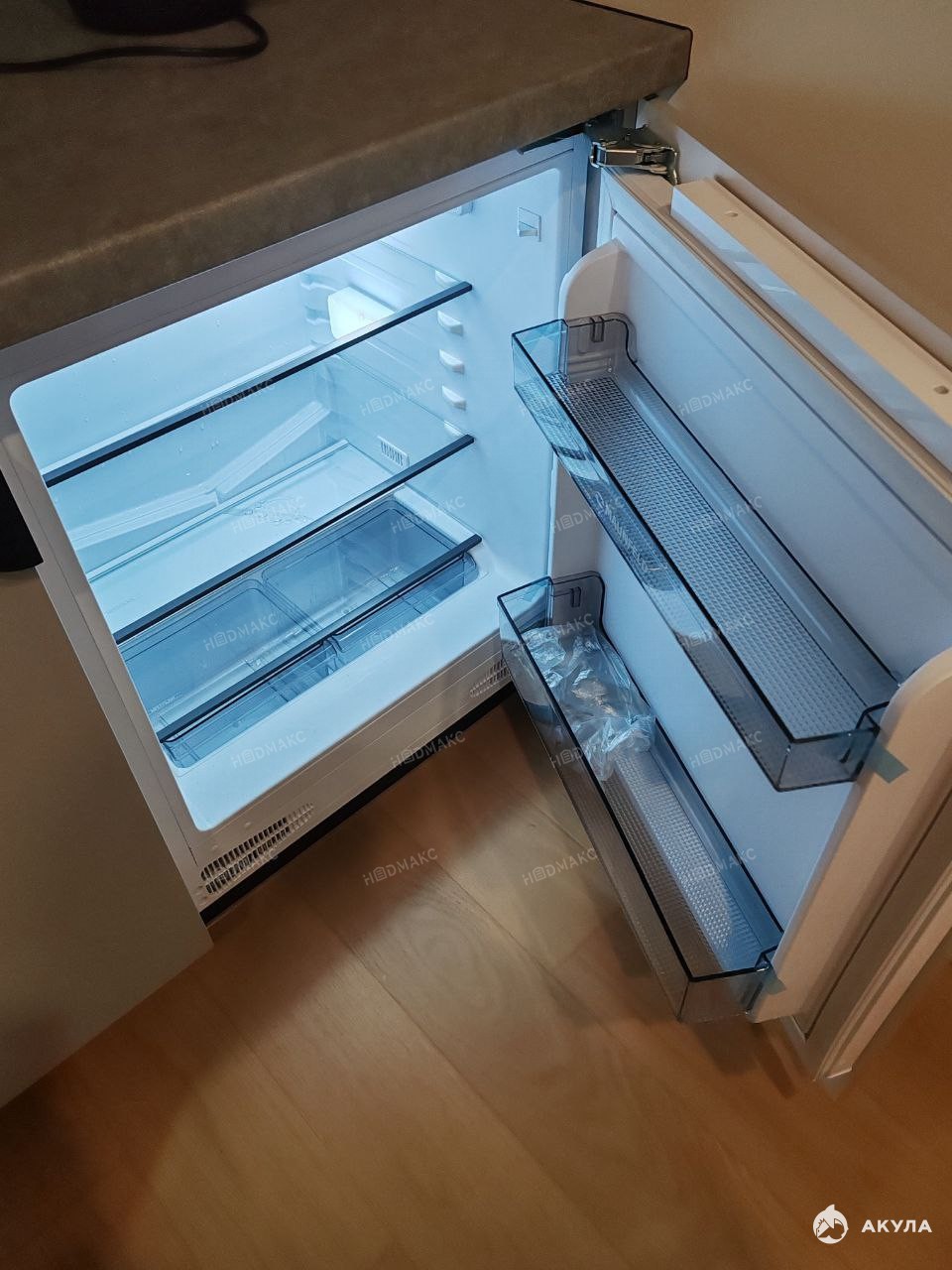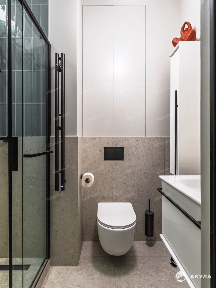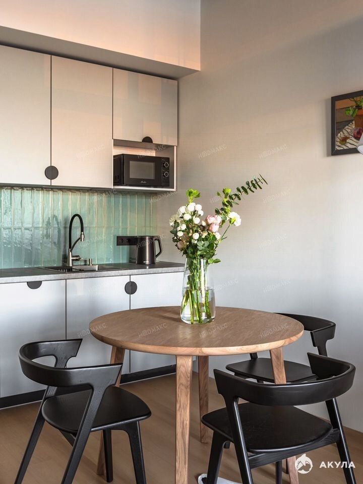 Практичная встроенная техника: мини-холодильник, посудомоечная машина, плита, вытяжка, стиральная машина, водонагреватель, ручной пылесос.
