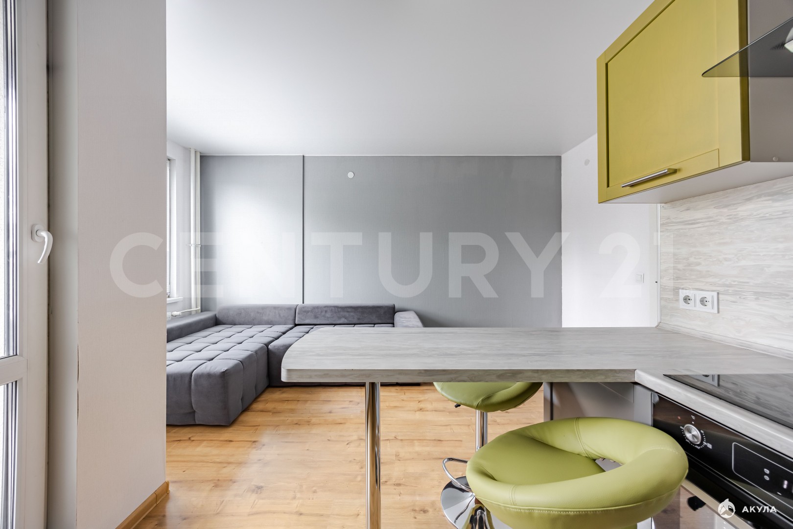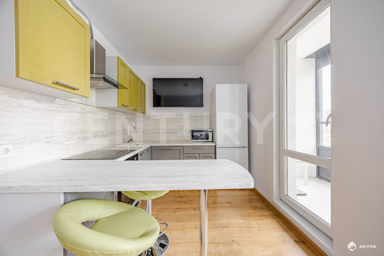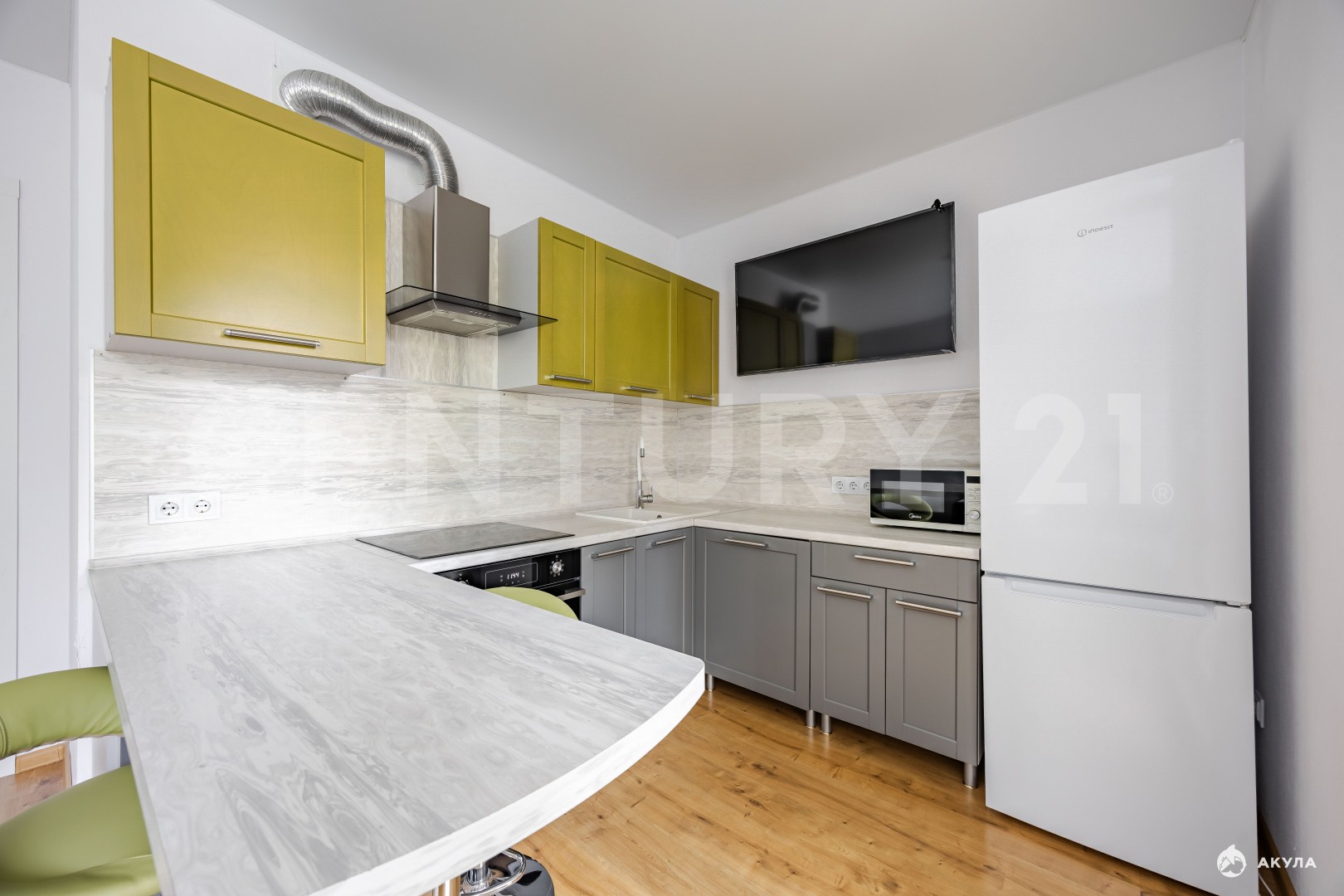 Мебель и техника: полностью меблирована, есть вся необходимая бытовая техника — микроволновая печь, двухкамерный холодильник, стиральная машина, сушилка, гладильная доска и утюг, большой раскладывающийся диван, кухонный гарнитур со встроенной техникой, барная стойка и кресла, большой телевизор, встроенный шкаф