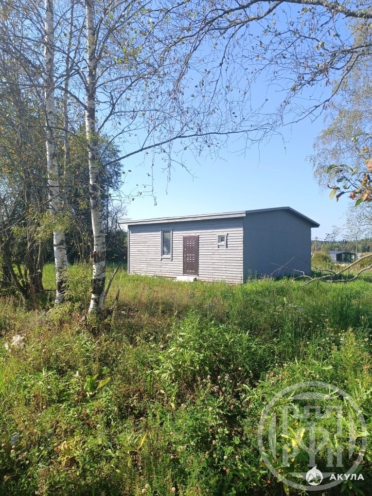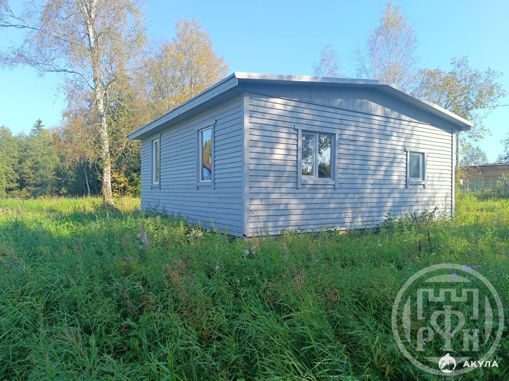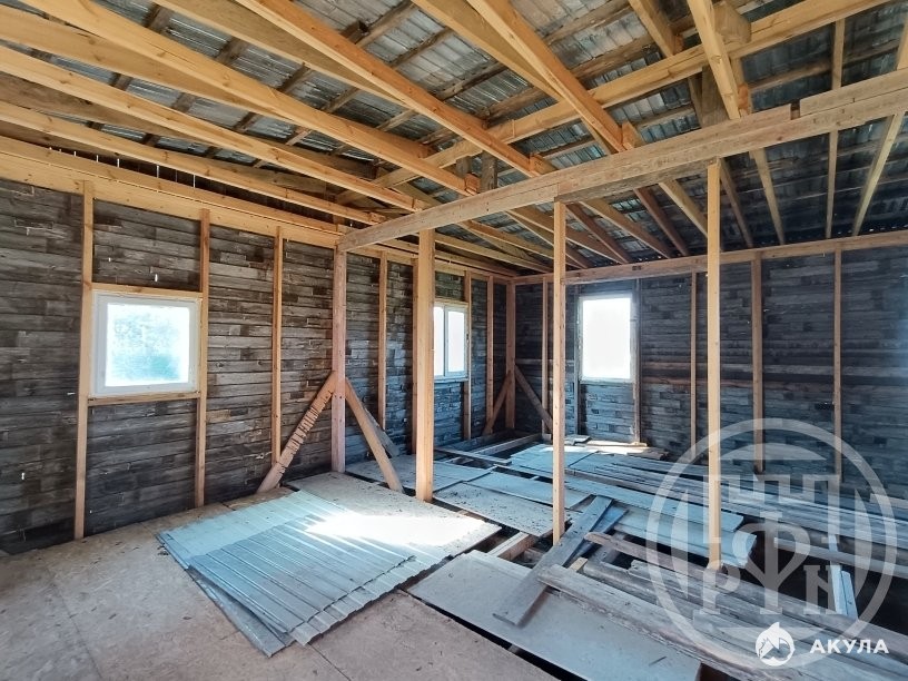 На участке дом, незавершённое строительство. Каркасный, снаружи обшит вагонкой, установлены стеклопакеты. Без утепления и внутренней отделки.