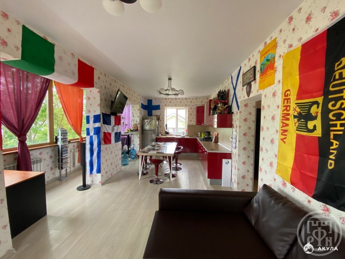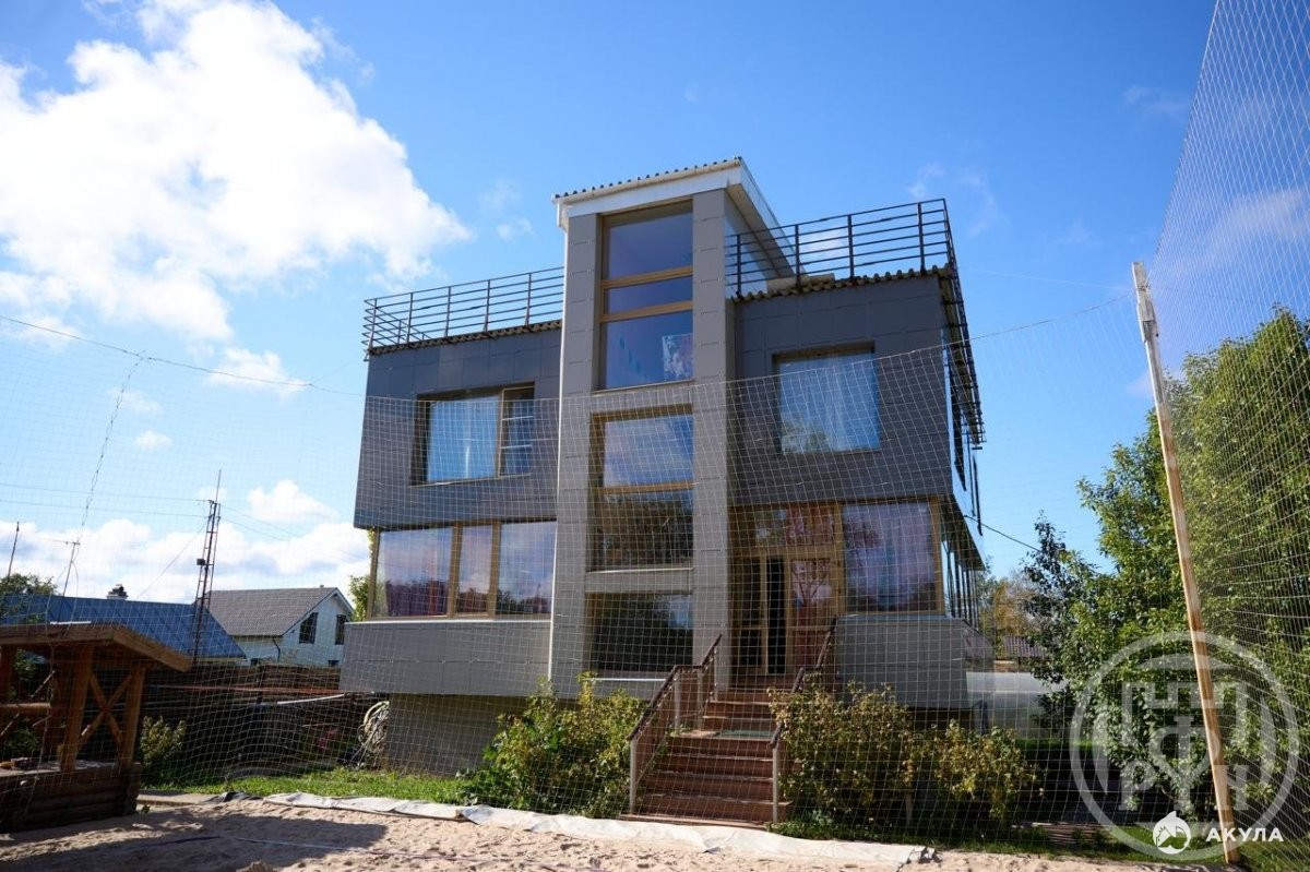 №210837 Продаётся коттедж на берегу озера в 50 метрах вторая линия с прекрасным видом на озеро из окон, озеро окружено волшебным лесом! На участке плодоносящие яблони и груши. Современный трёхэтажный дом с эксплуатируемой кровлей и выходом на террасу 100 метров площадью, один этаж на половину углублён в землю! На первом этаже можно попариться в русской бане и искупаться в бассейне принять душ и отдохнуть в комнате отдыха! На втором этаже кухня гостиная и детская комната! на третьем этаже четыре отдельных спальни! Система отопления во всём доме тёплые полы и батареи! В доме два санузла и три Душа!