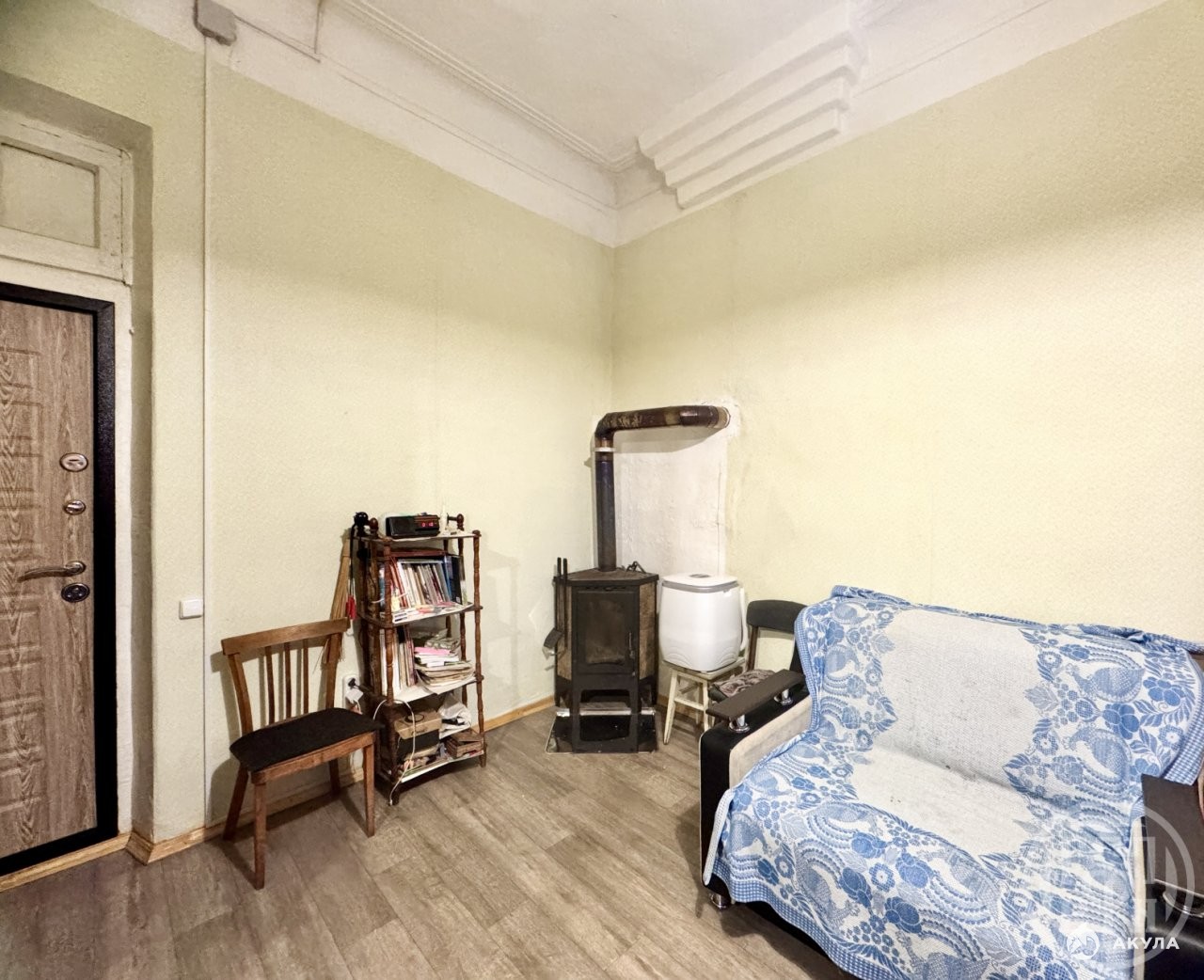 Комната с косметическим ремонтом и высокими потолками, установлена печь.