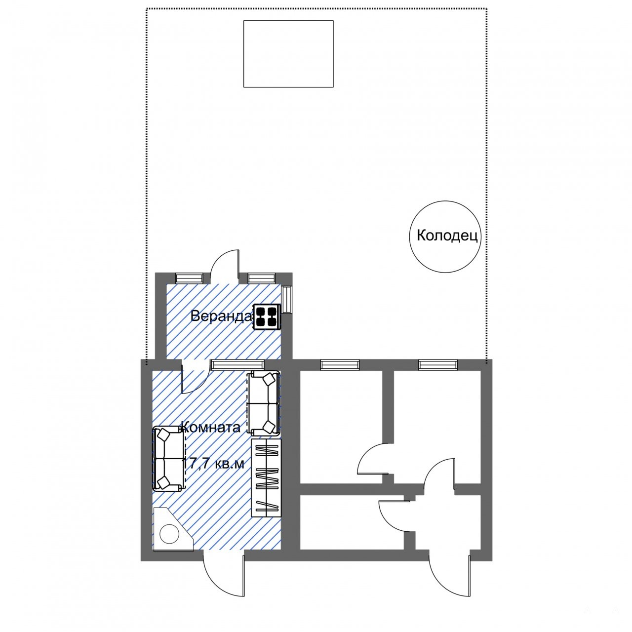 К комнате пристроена летняя веранда с выходом на участок, установлены стеклопакеты.