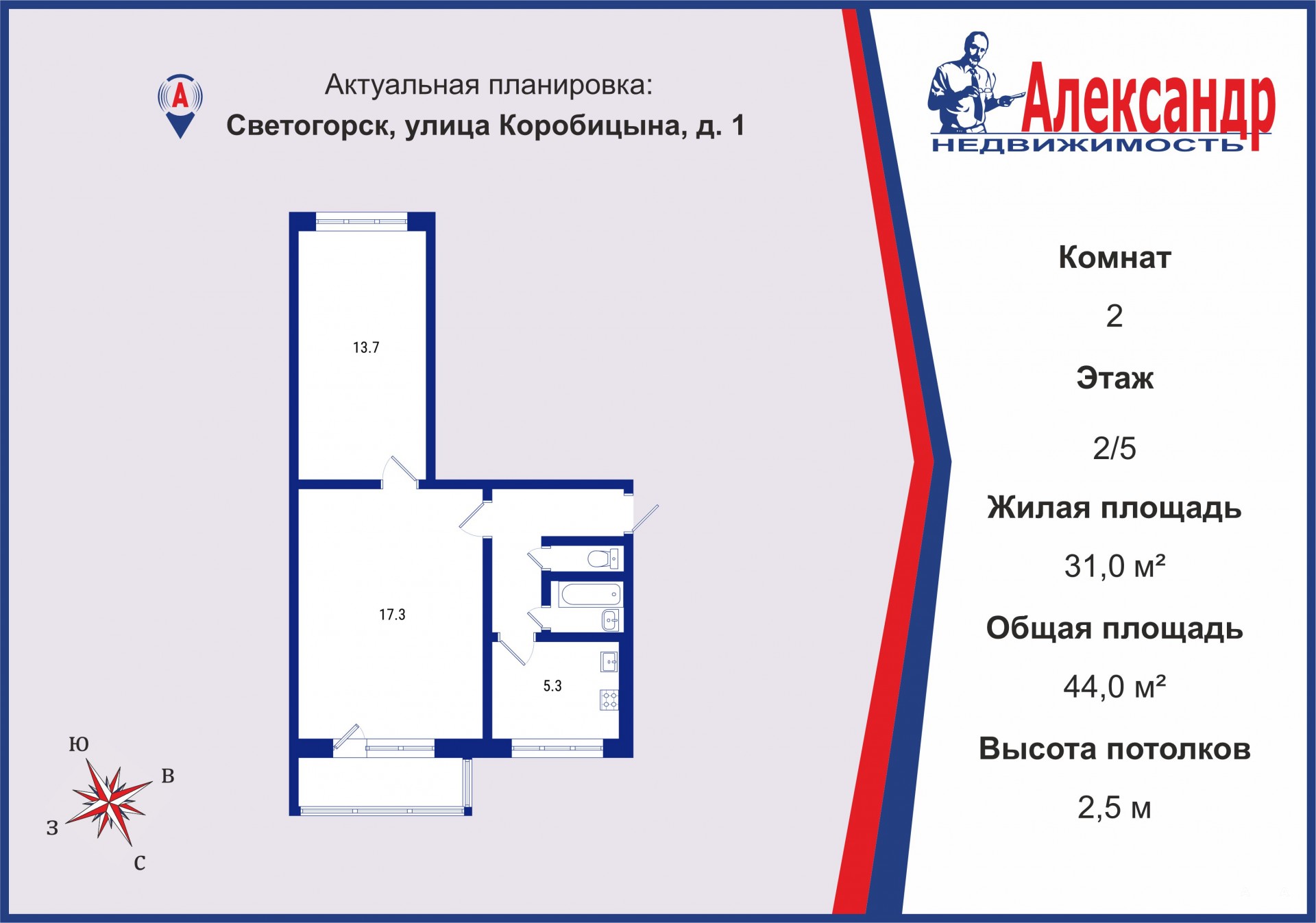 1701348 Продается 2-комнатная квартира в г. Светогорске, ул. Коробицына дом 1. Квартира расположена на комфортном 2-м этаже 5-ти этажного панельного дома 1973 года постройки.