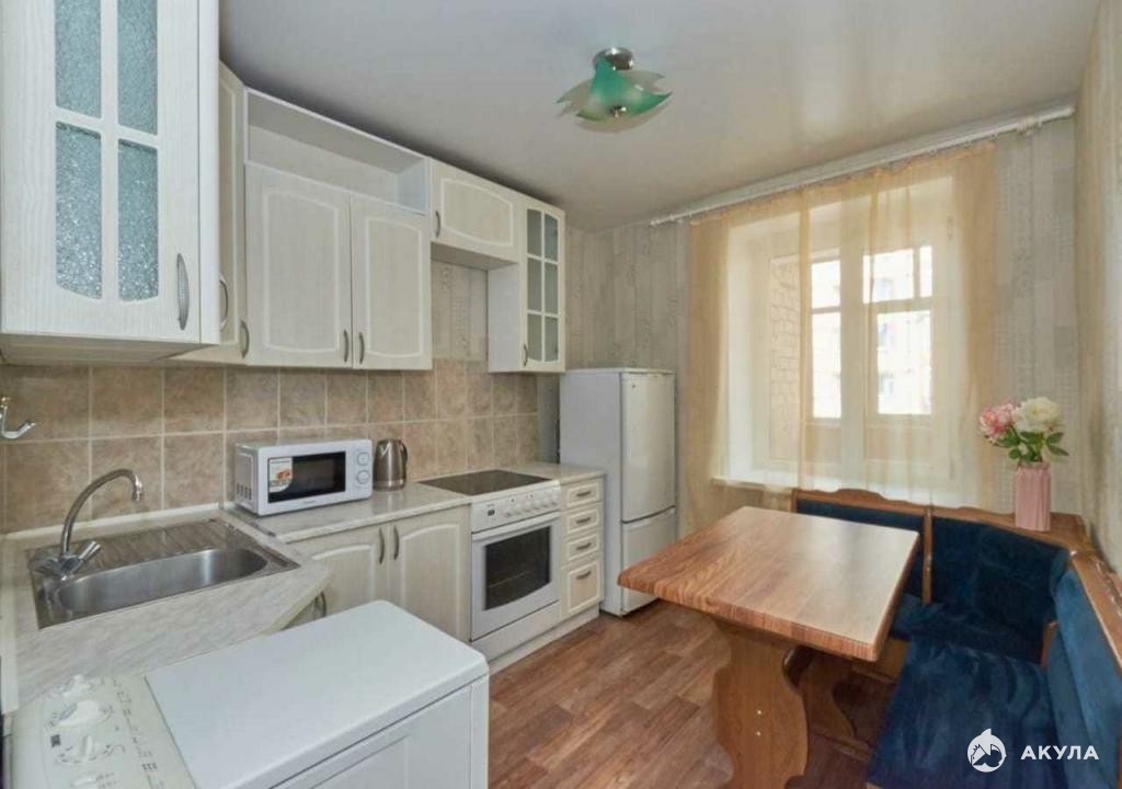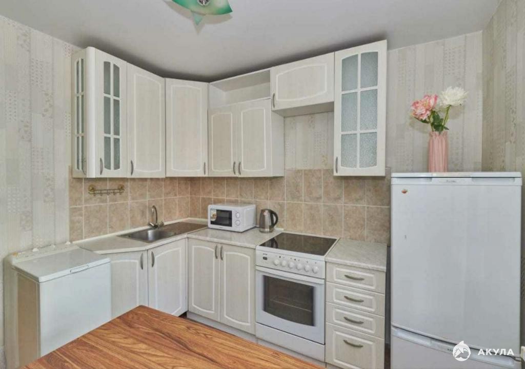 Полностью оборудованная кухня: холодильник, плита с 4 конфорками, духовка, микроволновка, электрический чайник, небольшой набор посуды.