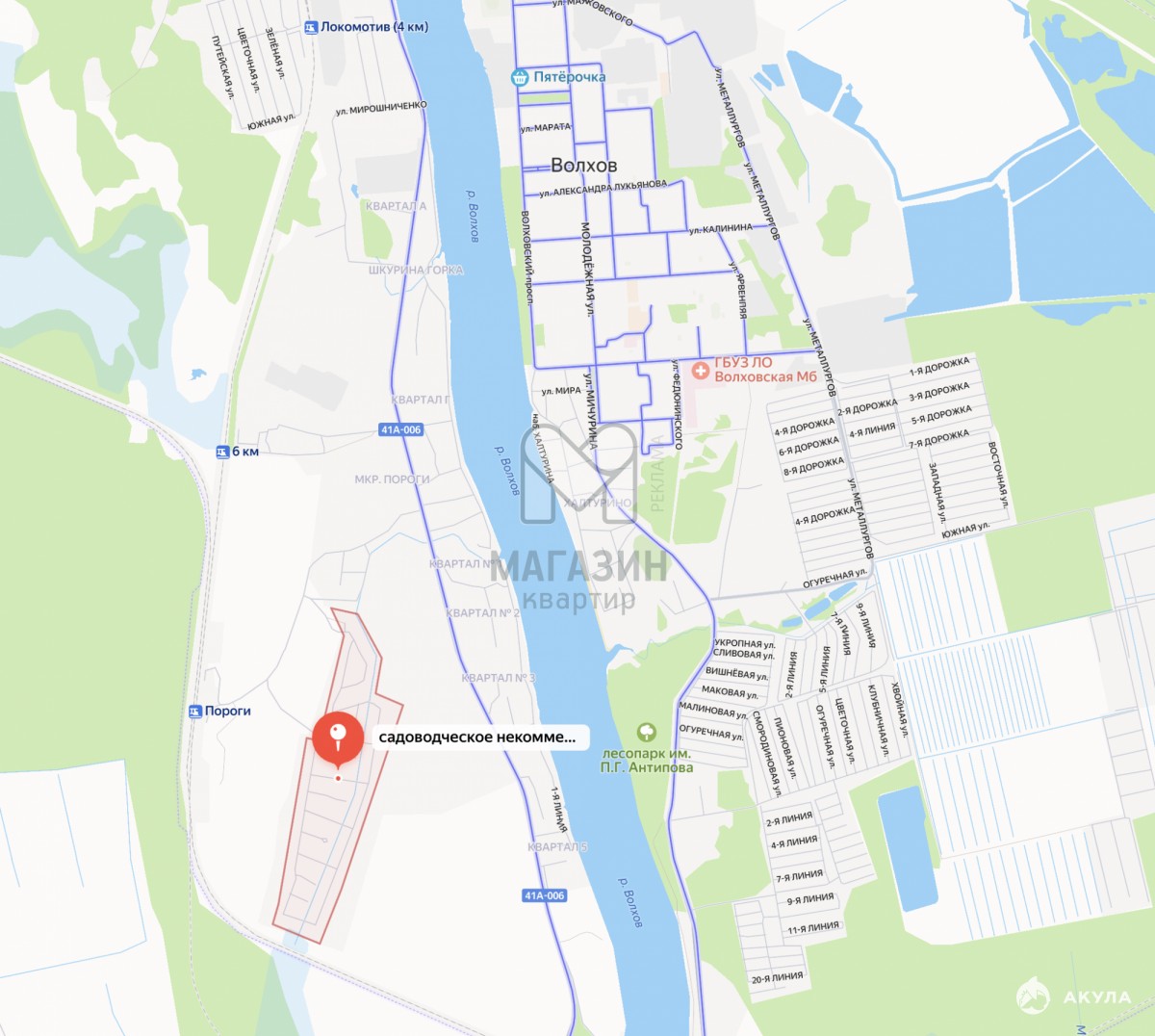 Продается участок 12 соток в г. Волхов,  СНТ "Пороги" Категория земель – Земли населенных пунктов,  Межевание есть. Электричество 15кВт, строительство разрешено.