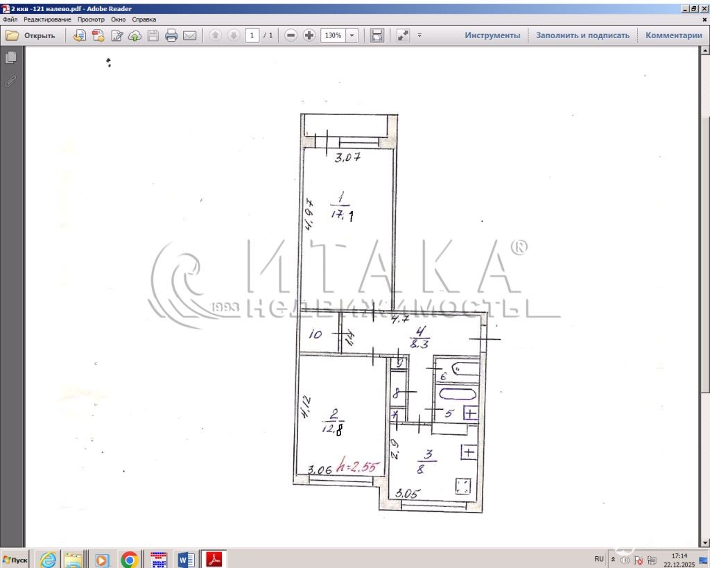 комнаты – 17, 1 + 12.8 кв.м, кухня – 8, 3 кв.м,