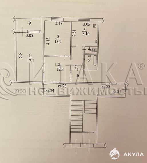 общая площадь 57, 6 кв.м: комнаты изолированные -17.1 кв.м и 13.2 кв.м, кухня - 8.1 кв.м