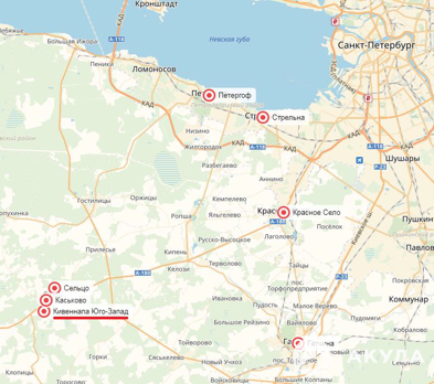 Территория расположен а в заселенном поселке «Кивеннапа Юго-Запад», в окружении живописных лугов и лесов, в близи каскада озер –Лопухинского, Дудергофского, Долгого, Безымянного. Участок имеет прямоугольную форму с ровными краями. Территория отделена от трассы полосой зеленых насаждений с плотной посадкой, что значительно снижает уровень шума и загрязнений. С западной стороны участок окружает лесные массивы, с севера и юга–луга. Имеется съезд с трассы М-11 на территорию участков. Участок находится в непосредственной близости д. Каськово и пос. Сельцо. Расстояние до границы Санкт-Петербурга (в районе Красного Села) составляет 28 км, до КАД - 39 км. В радиусе 20-40 минутной транспортной доступности находятся города: Волосово, Гатчина, Ломоносов, Петродворец, Красное Село, Стрельна. Местоположение участка: Ближайшие дороги: дорога федерального значения М-11 «Нарва», федеральная автодорога А-120 «Санкт-Петербургское южное полукольцо», дорога регионального значения Анташи – Ропша – Красное Село. Наличие удобных автодорожных коммуникаций позволяет обеспечить получасовую транспортную доступность на автомобиле от Кольцевой автодороги Санкт-Петербурга из четырех различных точек, что дает возможность избежать транспортные заторы на въезде в Санкт-Петербург. Наличие удобной связи по Кольцевой автодороге через Кронштадт обеспечивает приемлемую транспортную доступность территории Сельцовского сельского поселения даже для жителей северных районов Санкт-Петербурга.