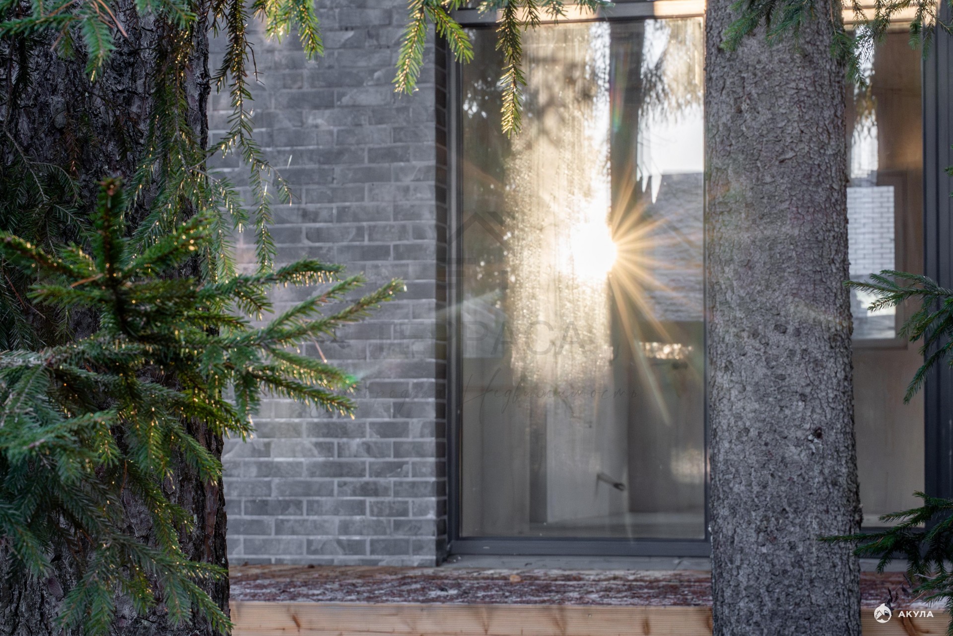 · Локация и окружение: Дом расположен рядом с «Охта Парк», в закрытом, безопасном квартале среди таких же стильных архитектурных решений. Высокие ели создают ощущение уединения и покоя.