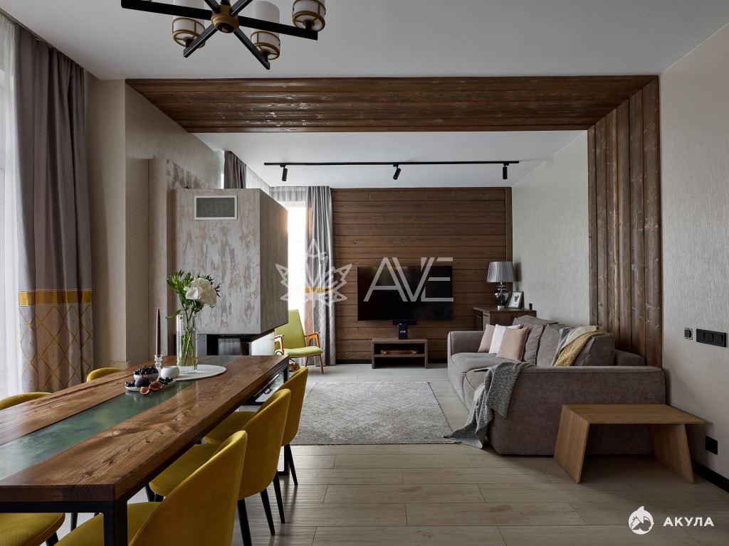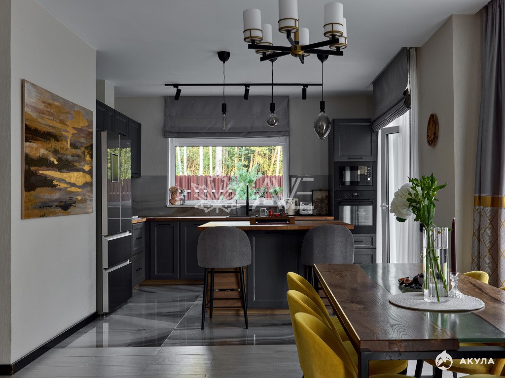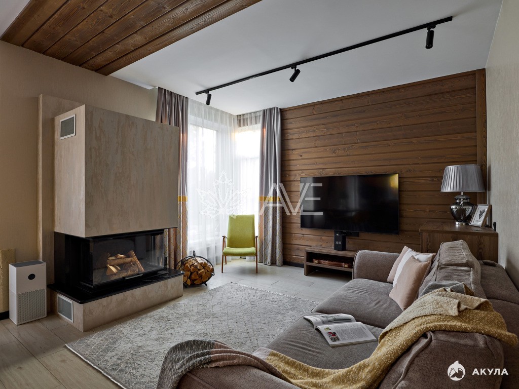 Сердце дома — кухня-гостиная с камином. Пространство зонировано: кухня с фактурными фасадами и островом, столовая группа с массивным деревянным столом, лаунж-зона с большим диваном и мягким ковром, камин, создающий атмосферу тепла и большой телевизор для семейных просмотров любимых фильмов. Из кухни есть выход на террасу, где оборудована летняя зона с мангалом, которая закрыта мягкими окнами и используется с ранней весны до глубокой осени — идеальное место для отдыха на открытом воздухе.