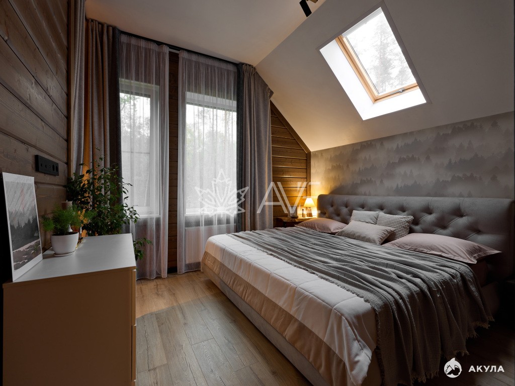 Дом выполнен в современном стиле Барн-Хаус с использованием вертикального планкена в сочетании с фиброцементными панелями, благодаря такой комбинации он буквально вписывается в окружающую природу. Внутри — четыре спальни, каждая с индивидуальным характером: