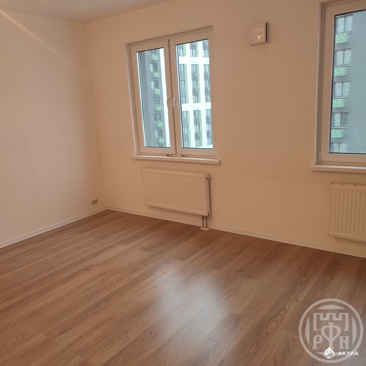 Окна с вентиляционными клапанами и защитой от детей. Под окно прикреплен короб для установки кондиционера. Все счетчики выведены в общий коридор.