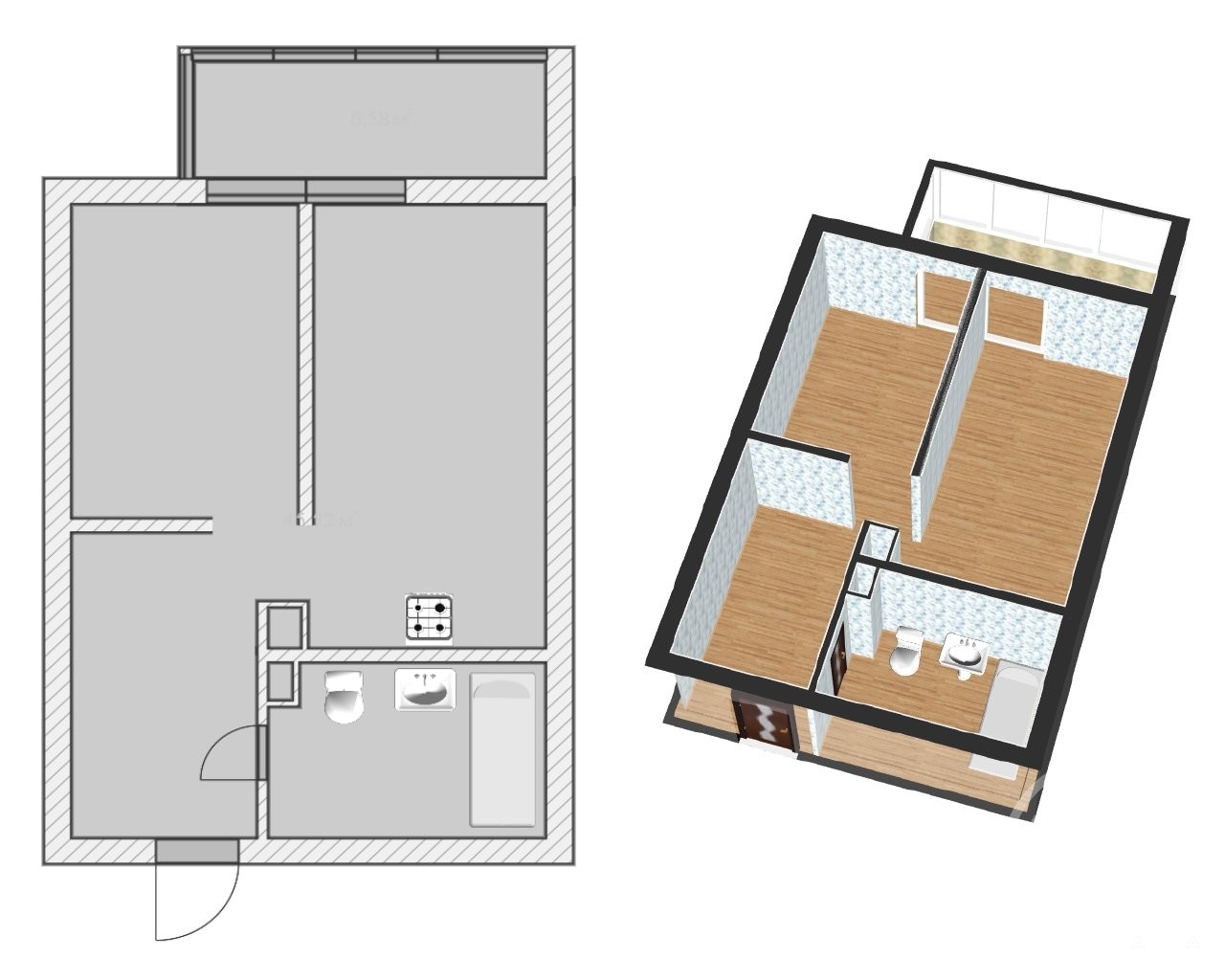 Студия 26, 7 кв м + 3, 5 кв м балкон, но выглядит как маленькая, полноценная `евродвушка`, с отдельными окнами и с кухни и с комнаты, отделённой кухонной зоной, совмещённым СУ и большой прихожей. Окна большие , современные, `в пол`, оба с выходом на застекленный балкон.. Вид с балкона на сосновый лес. Рядом с домом детский сад, школа, продовольственные и сетевые магазины, автобус до м.Ладожская и до ЖД платформы-Всеволожская.