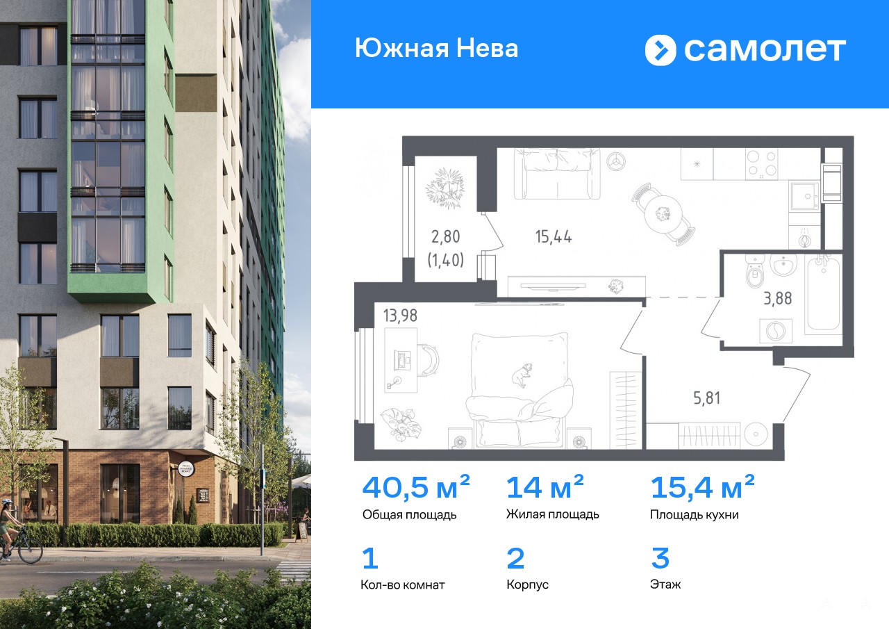 Предлагается 1-комнатная квартира комфорт-класса 40, 51 кв.м в корпусе 2 на 3 этаже, в ЖК «Южная Нева»
