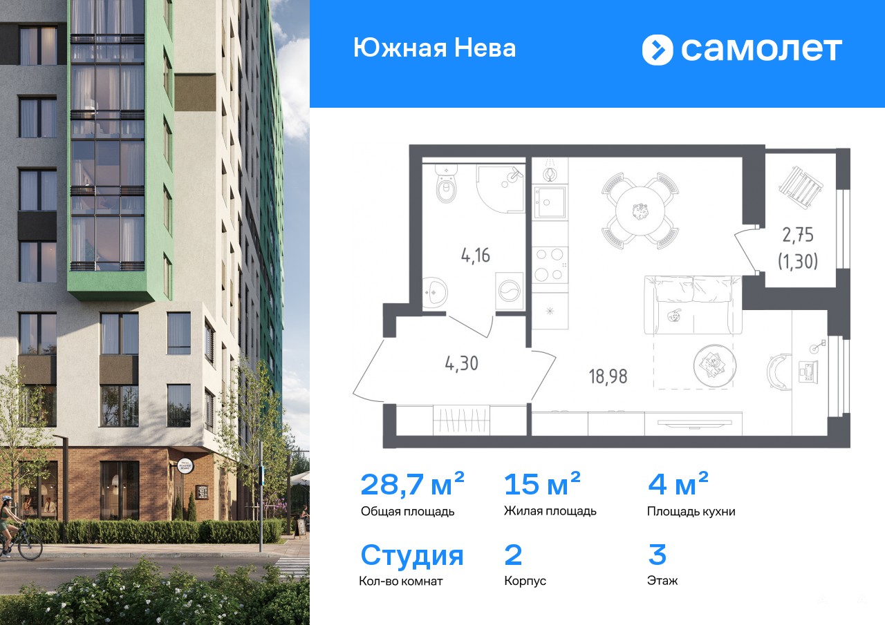 Предлагается квартира студия комфорт-класса 28, 74 кв.м в корпусе 2 на 3 этаже, в ЖК «Южная Нева»