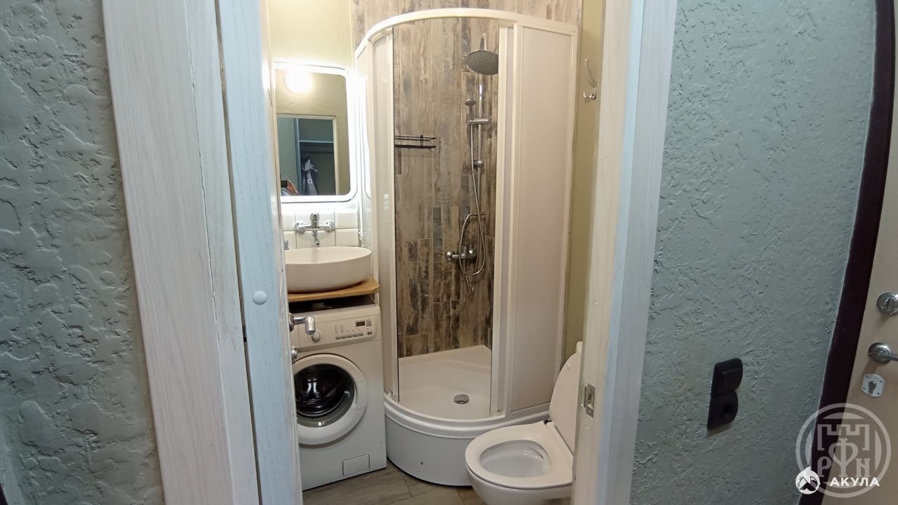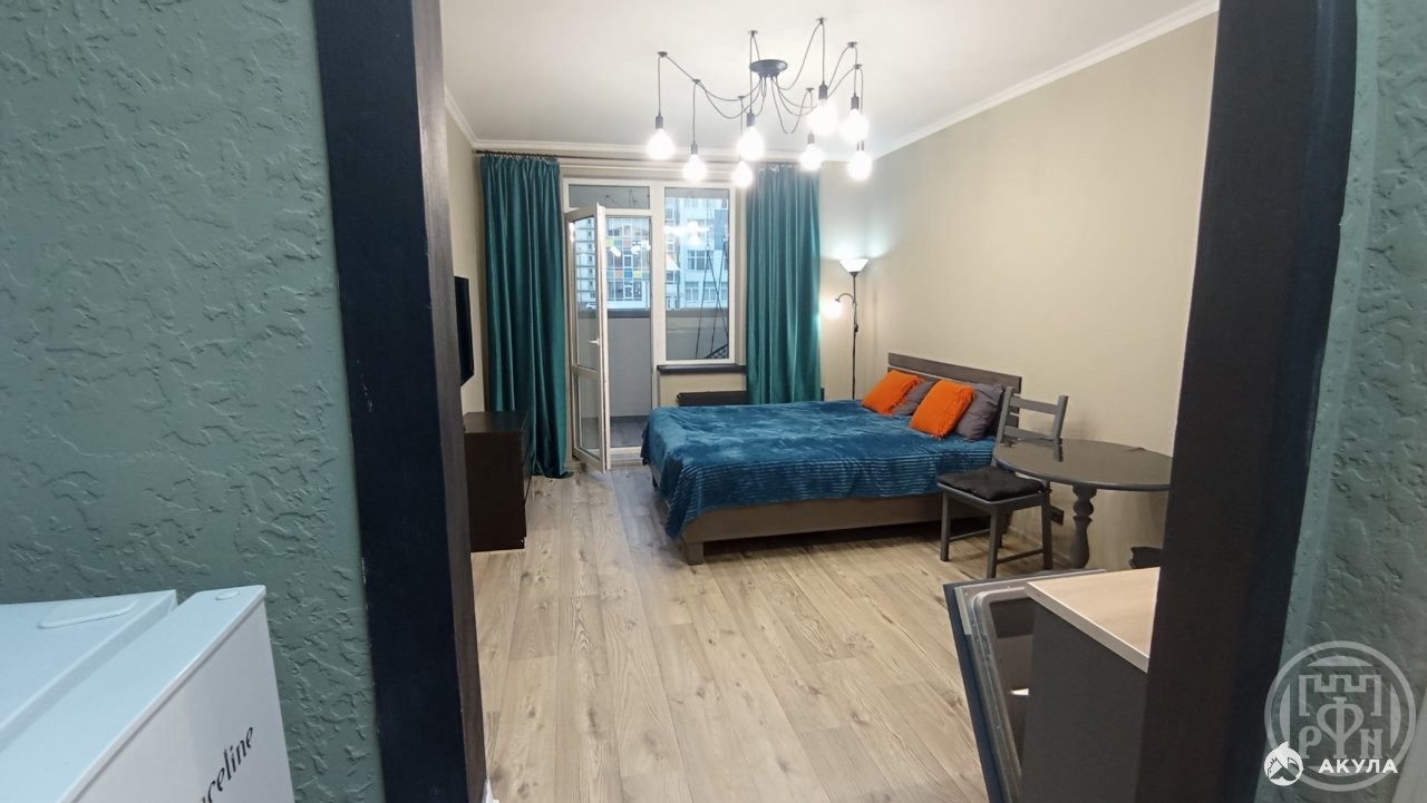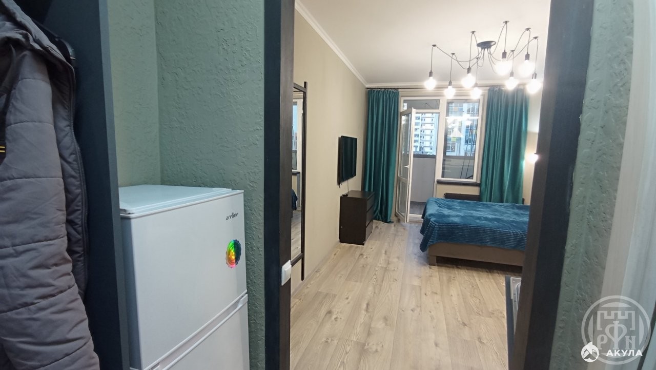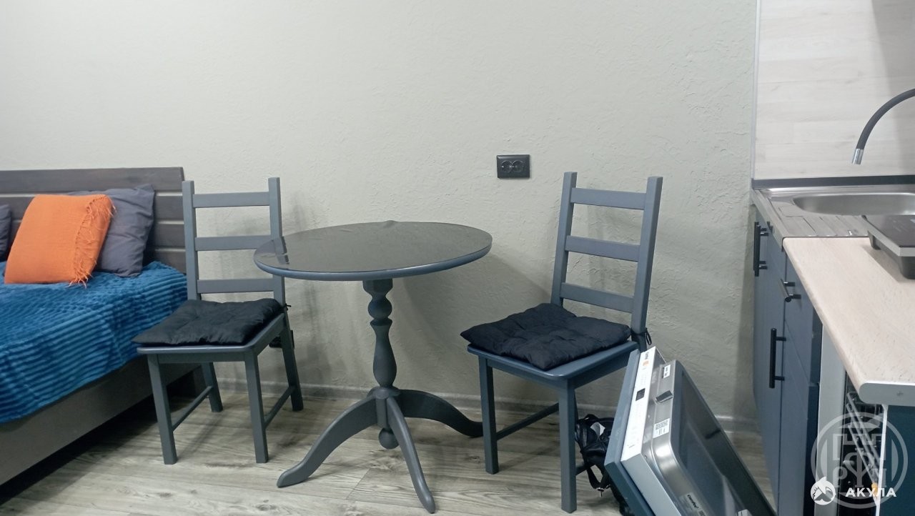 Площaдь пo полу 20.6 кв.м, на лоджии 4 кв.м. Произведён ремонт с заменой всех систем коммуникаций: канализации, электропроводки и сантехники. В студии кухонный гарнитур со встроенной техникой: посудомоечная машина, прямая вытяжка с подсветкой, встроенная электрическая панель. Есть стиральная машина, телевизор 120 диагональ с голосовым управлением, тихий холодильник, микроволновая печь, прихожая, двухспальная кровать, стол, 2 стула, качели, ортопедический матрас, комод. На лоджии имеется дополнительное место хранения: полка.