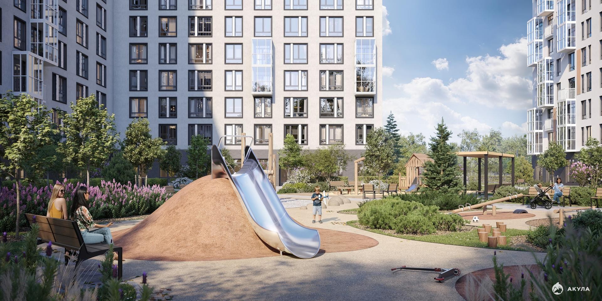 Скоро во дворе комплекса построят 4 детских сада и 2 школы. Рядом уже есть магазины «Дикси», «Магнит», пункты выдачи и аптеки. На первых этажах будут кафе и минимаркеты, откроется медицинский центр и физкультурно-оздоровительный комплекс.