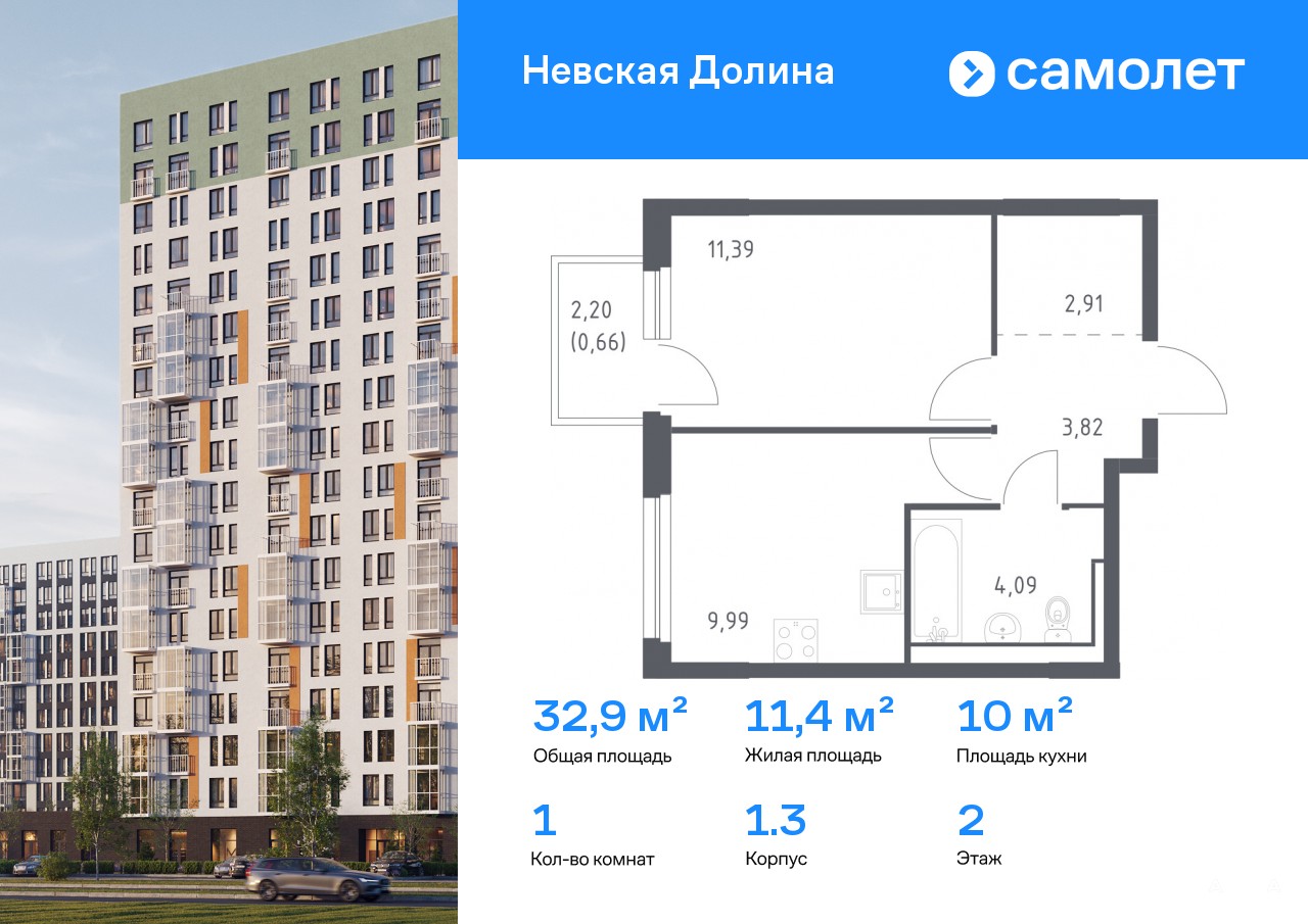 Строим кварталы для жизни с заботой о будущем. Предлагается 1-комнатная квартира комфорт-класса 32, 86 кв.м в корпусе 1.3 на 2 этаже, в ЖК «Невская Долина»