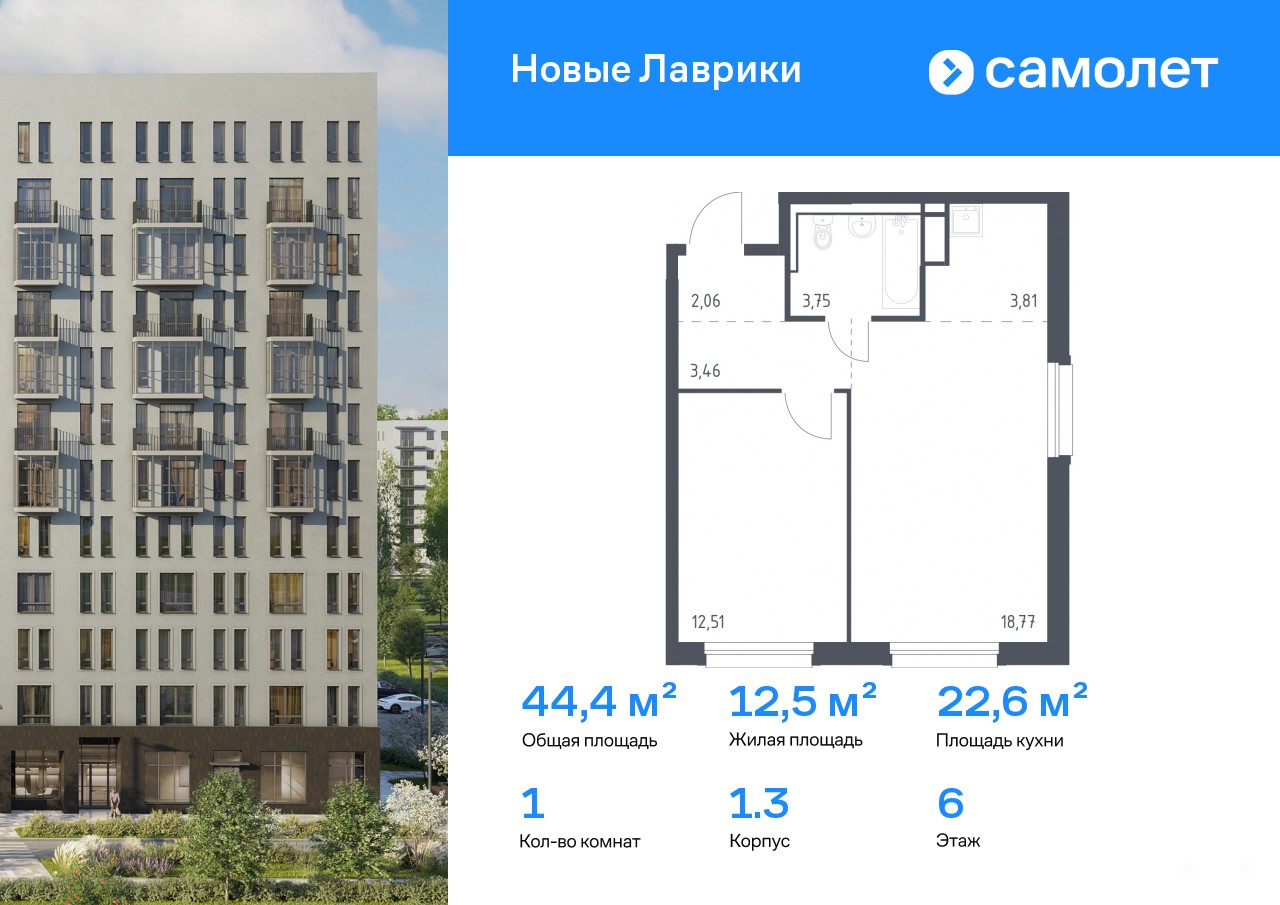 Строим кварталы для жизни с заботой о будущем. Предлагается 1-комнатная квартира комфорт-класса 44, 36 кв.м в корпусе 1.3 на 6 этаже, в ЖК «Новые Лаврики»