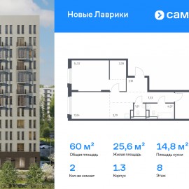 Строим кварталы для жизни с заботой о будущем. Предлагается 2-комнатная квартира комфорт-класса 60, 01 кв.м в корпусе 1.3 на 8 этаже, в ЖК «Новые Лаврики» Квартира с чистовой отделкой. Доступность дополнительных опций уточняйте у застройщика. Приобрести квартиру возможно по...