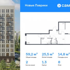Строим кварталы для жизни с заботой о будущем. Предлагается 2-комнатная квартира комфорт-класса 59, 22 кв.м в корпусе 1.3 на 8 этаже, в ЖК «Новые Лаврики» Квартира с предчистовой отделкой. Доступность дополнительных опций уточняйте у застройщика. Приобрести квартиру возможно...