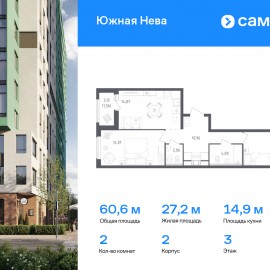 Строим кварталы для жизни с заботой о будущем. Предлагается 2-комнатная квартира комфорт-класса 60, 6 кв.м в корпусе 2 на 3 этаже, в ЖК «Южная Нева» Квартира без отделки. Доступность опции «отделка» и возможность комплектации мебелью и декором уточняйте у...