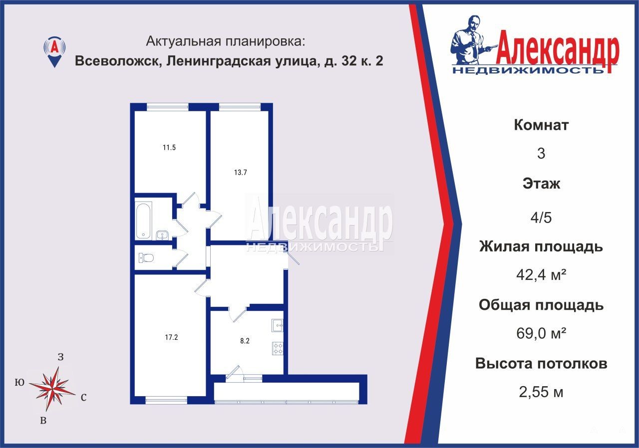 1704646 Продается трехкомнатная квартира, общей площадью 69 квадратных метров, жилой 42, 4 метра, по адресу: Ленинградская область, г. Всеволожск, ул. Ленинградская, дом 32, корпус 2. Квартира расположена на 4-ом этаже, 5-ти этажного дома.