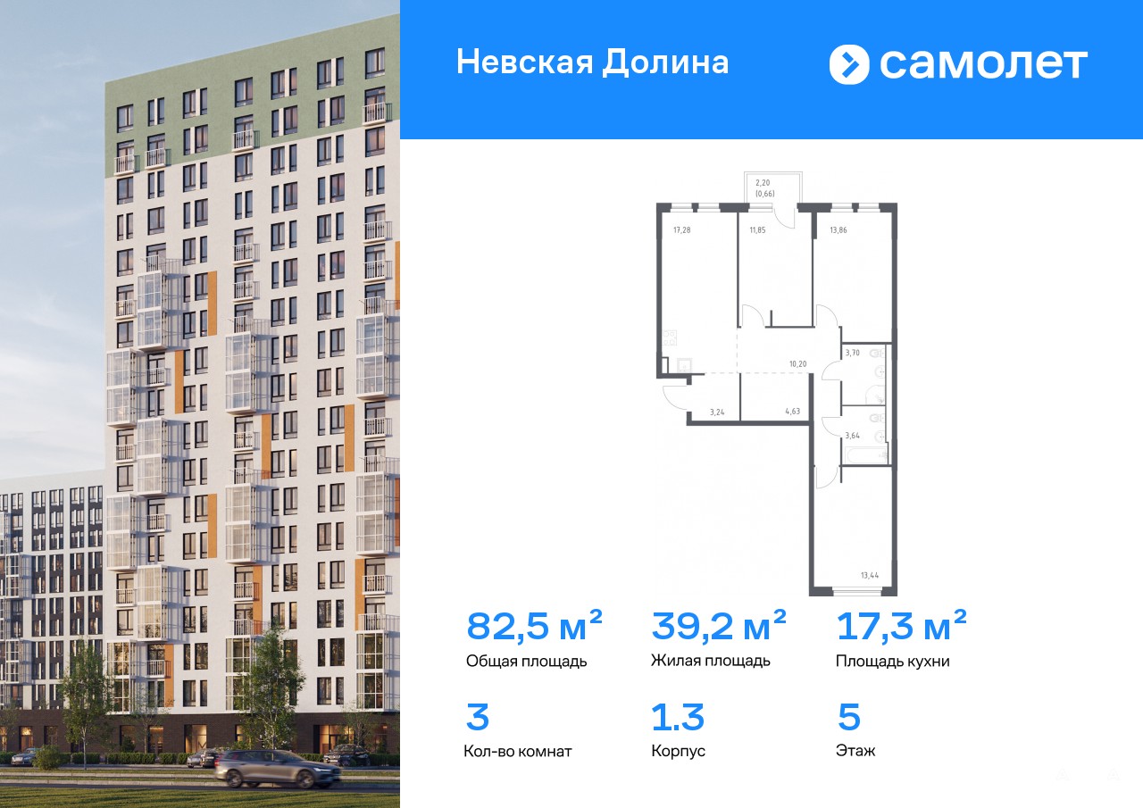 Строим кварталы для жизни с заботой о будущем. Предлагается 3-комнатная квартира комфорт-класса 82, 5 кв.м в корпусе 1.3 на 5 этаже, в ЖК «Невская Долина»