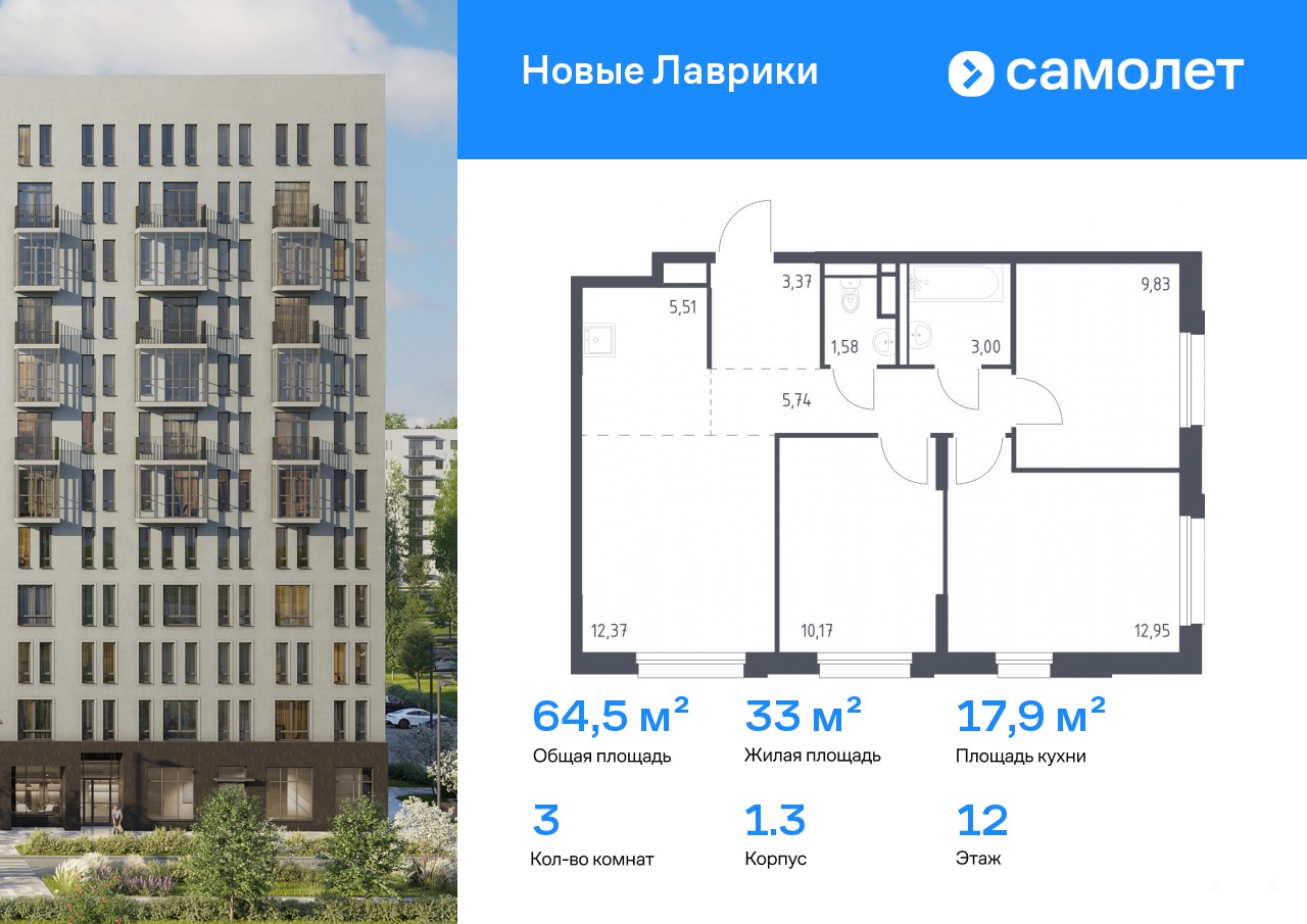 Предлагается 3-комнатная квартира комфорт-класса 64, 52 кв.м в корпусе 1.3 на 12 этаже, в ЖК «Новые Лаврики»