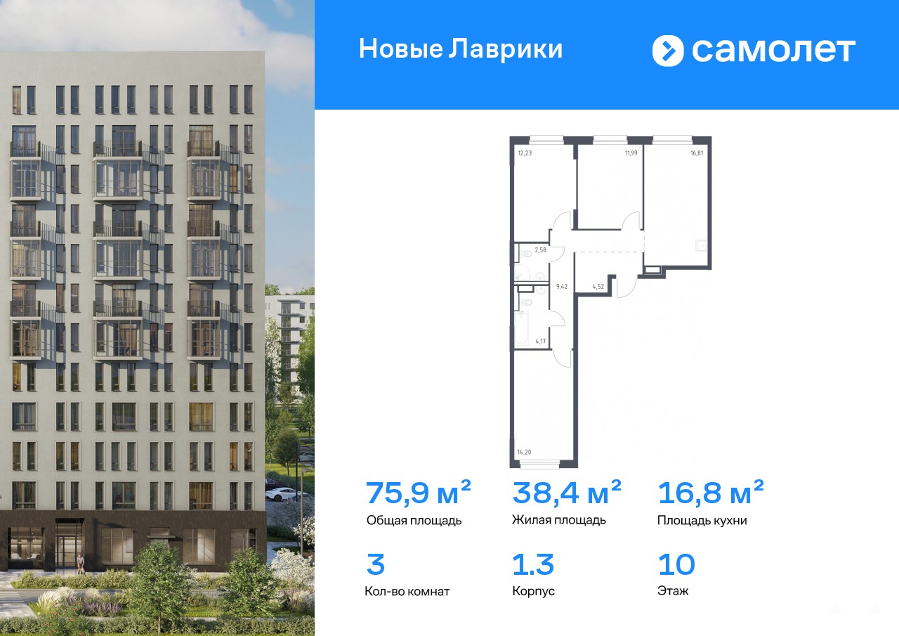 Строим кварталы для жизни с заботой о будущем. Предлагается 3-комнатная квартира комфорт-класса 75, 92 кв.м в корпусе 1.3 на 10 этаже, в ЖК «Новые Лаврики»