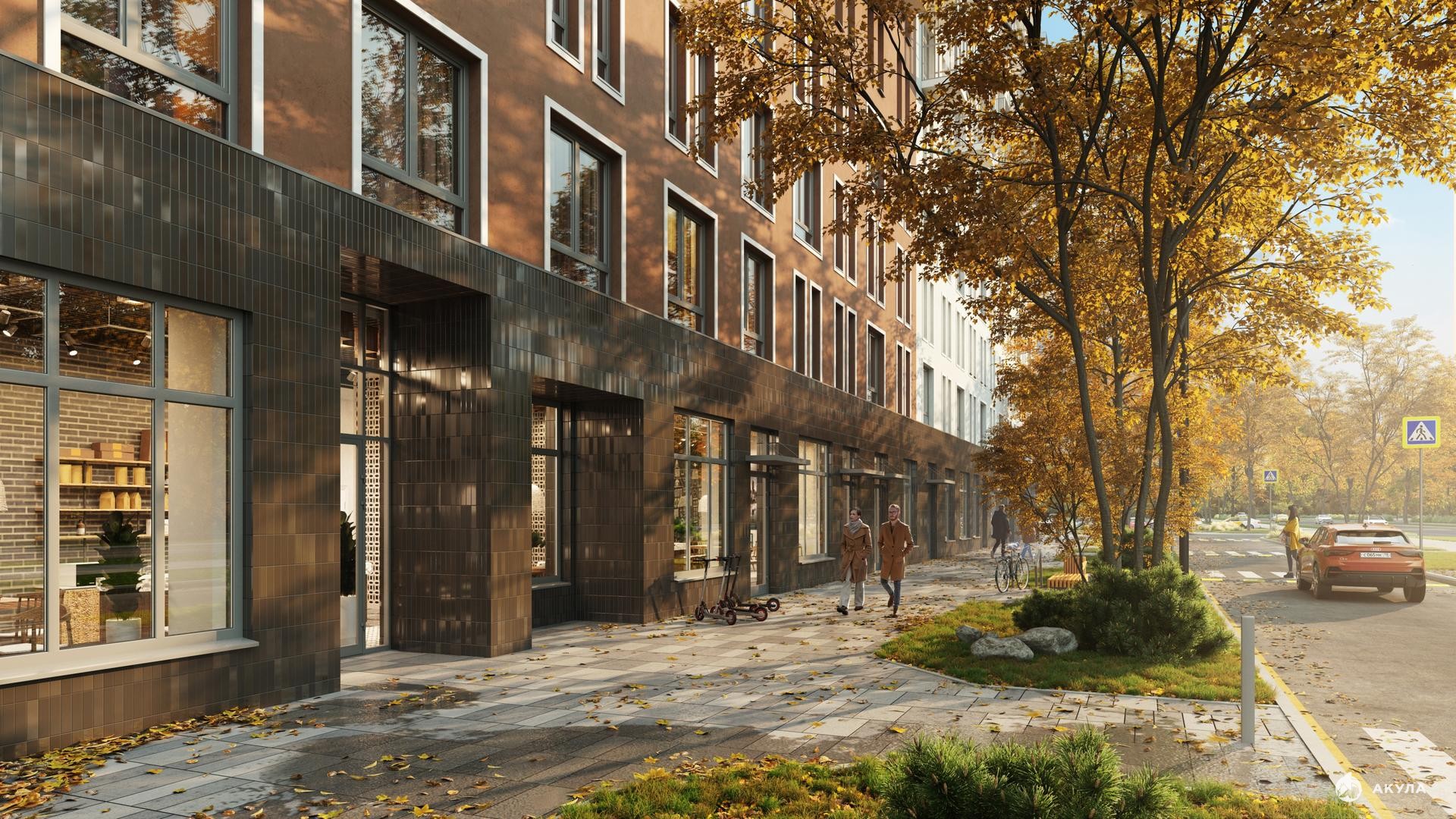 В приватном дворе-парке без машин дети будут играть на площадках в экостиле, а взрослые — заниматься йогой на воркаут-площадках. Для машин — плоскостной и подземный паркинги.