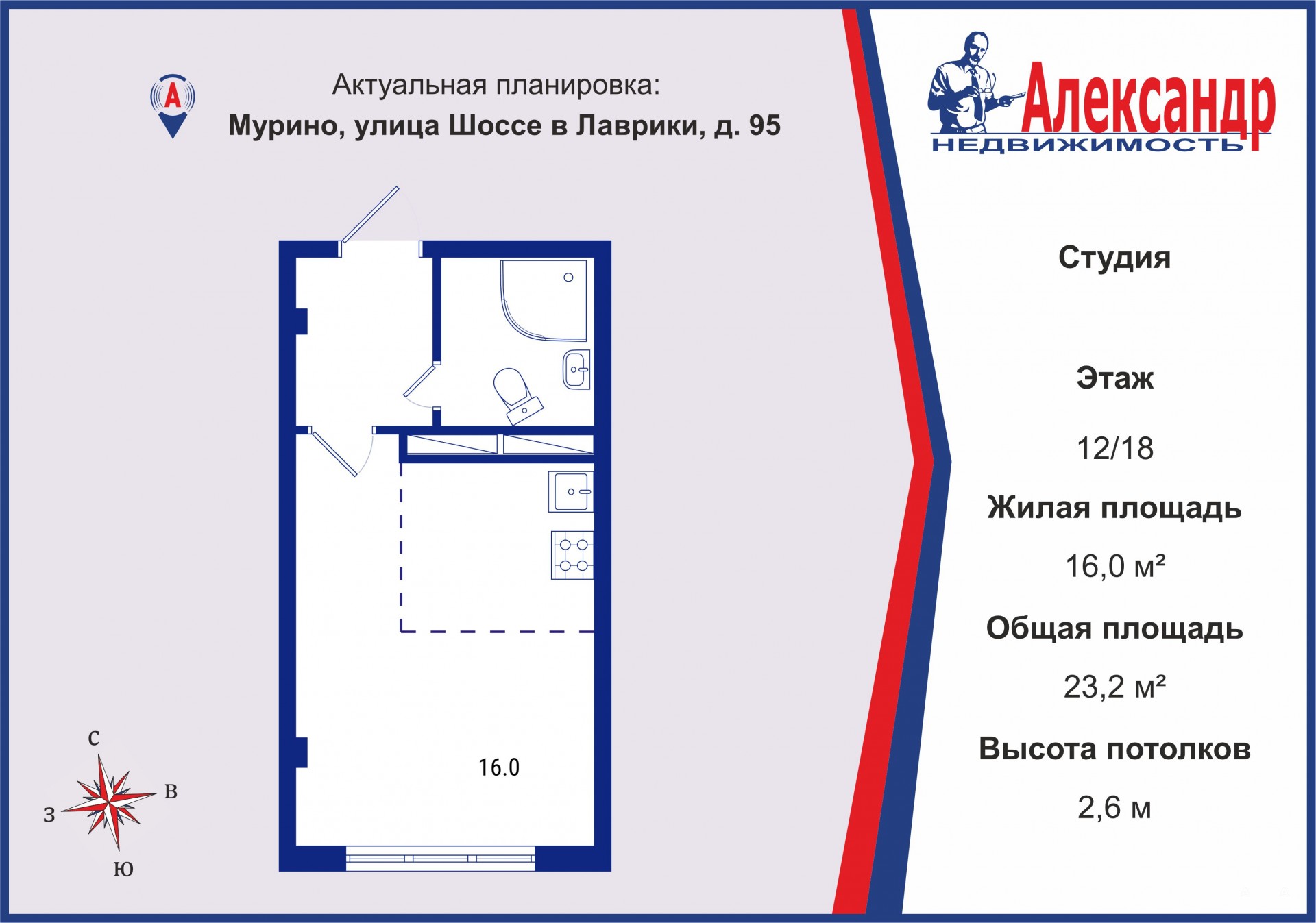 Светлая и теплая квартира-студия общей площадью 23.20 м² на 12 этаже;