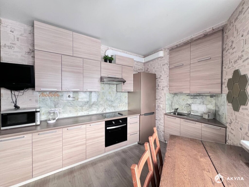 Просторная кухня наполнена светом и укомплектована современной техникой: посудомоечной машиной, микроволновой печью, электрической плитой, а также новым духовым шкафом. Здесь же находится раскладывающийся диван, который можно использовать как дополнительное спальное место.