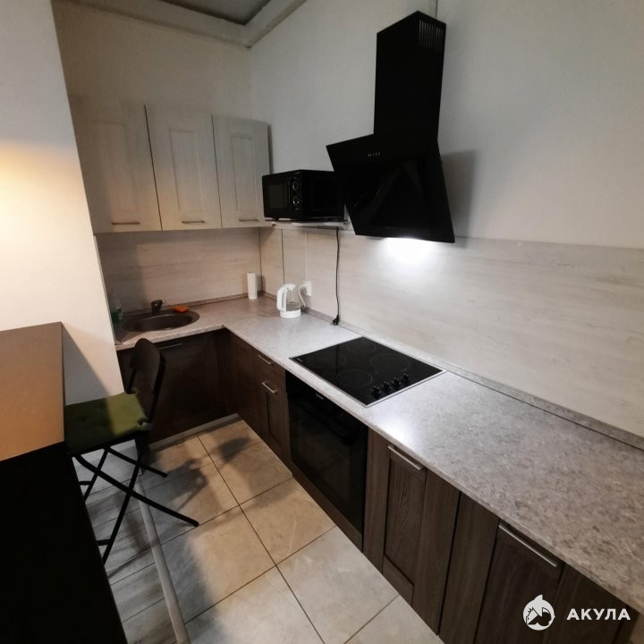 Полностью оборудованная кухня: холодильник, плита с 4 конфорками, духовка, микроволновка, электрический чайник, небольшой набор посуды.