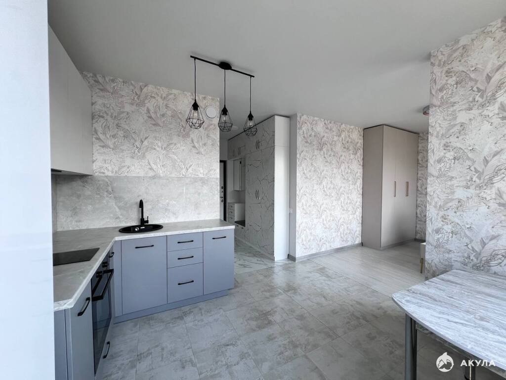 Пространство продуманно зонировано на кухонную и спальную зоны. Кухня оснащена всем необходимым для приготовления — установлена вытяжка, удобный рабочий стол, два стула (на фото нет).