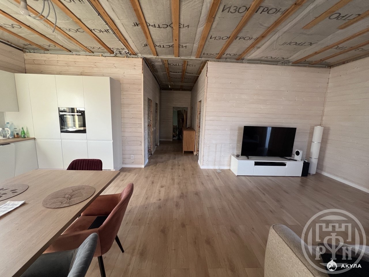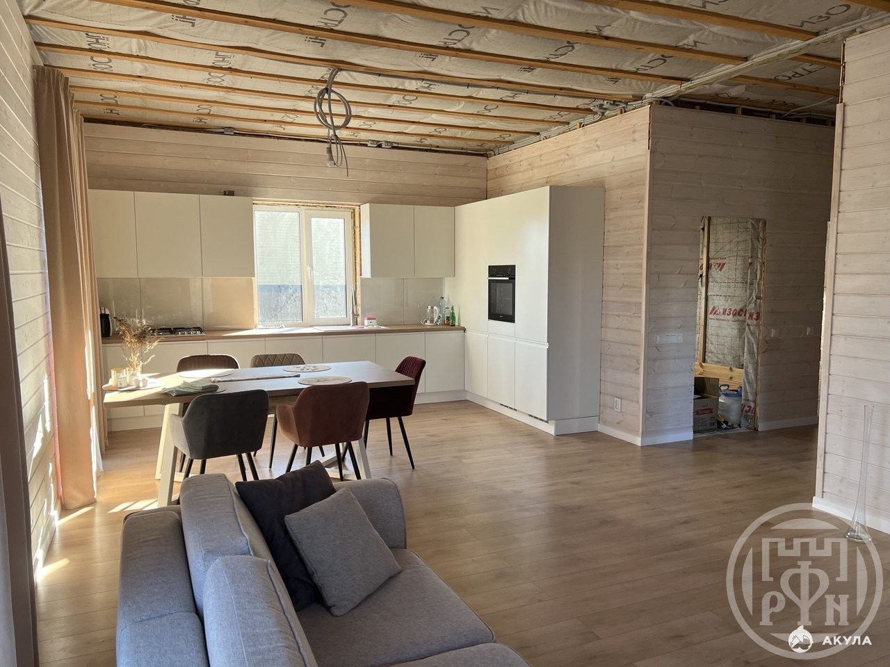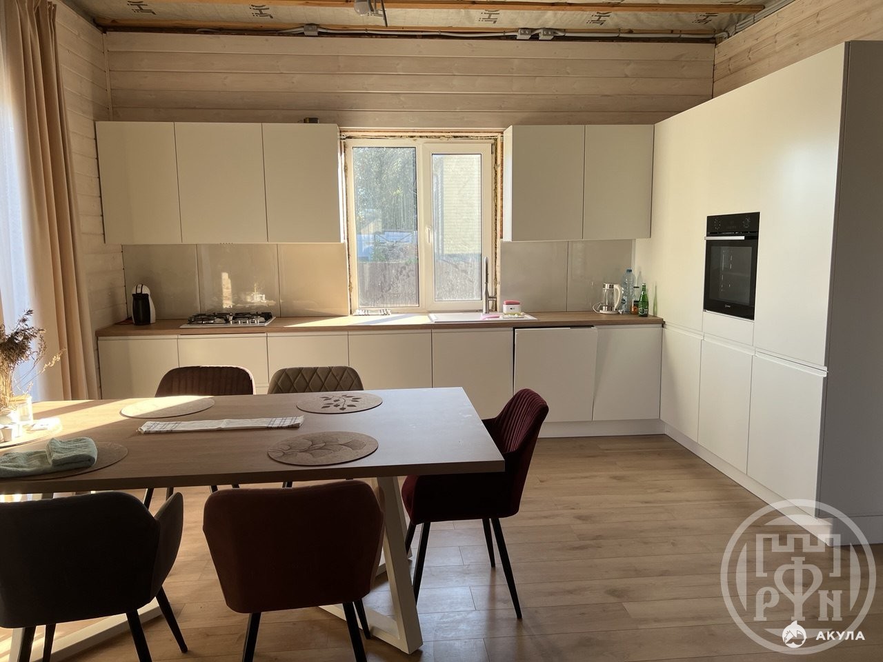 На кухне установлена мебель по индивидуальному проекту, полностью оборудована техникой (холодильник, посудомоечная машина, духовой шкаф, варочная панель, вытяжка).   В гостиной расположились уютный мягкий уголок с телевизором. Спальные комнаты без внутренней отделки, что позволит будущему хозяину воплотить свои идеи.