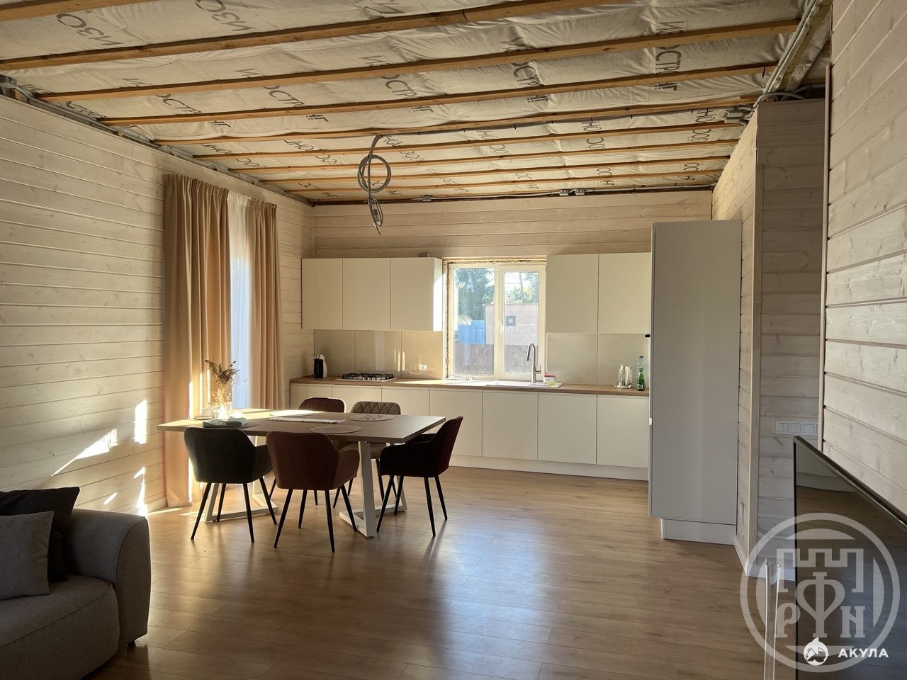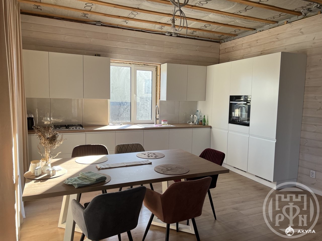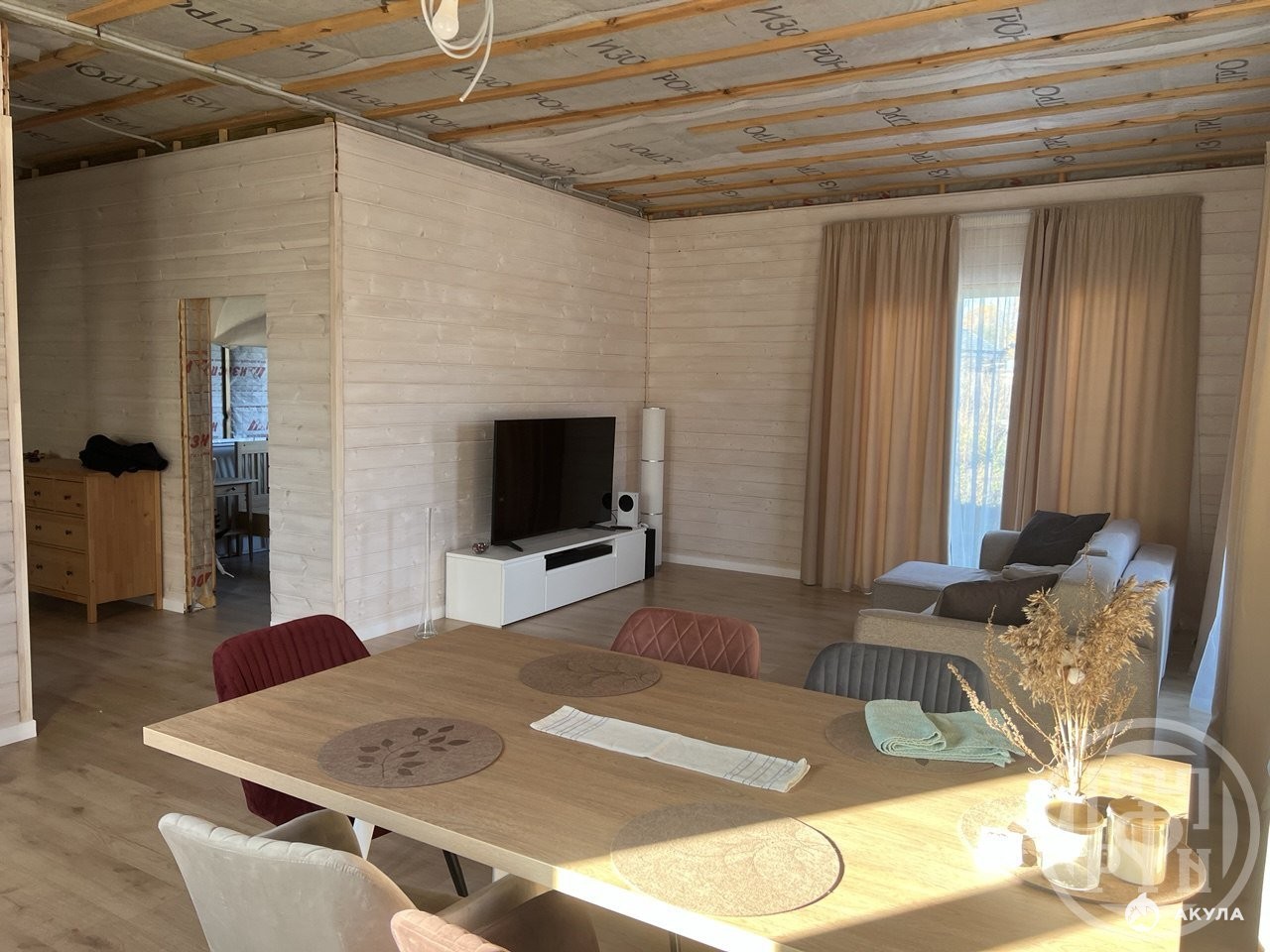 На кухне установлена мебель по индивидуальному проекту, полностью оборудована техникой (холодильник, посудомоечная машина, духовой шкаф, варочная панель, вытяжка).   В гостиной расположились уютный мягкий уголок с телевизором. Спальные комнаты без внутренней отделки, что позволит будущему хозяину воплотить свои идеи.