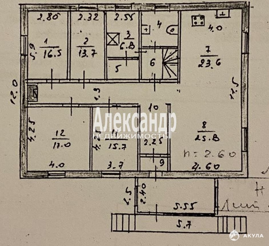Общая площадь дома составляет 363, 5 кв.м, площадь участка 25 соток.