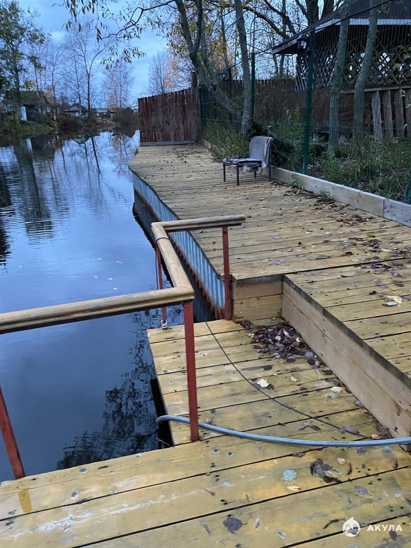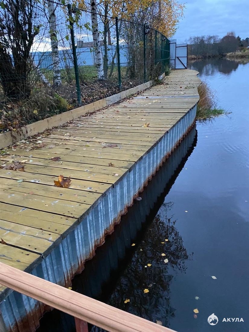 Участок примыкает вплотную к реке, где оборудована своя набережная с пляжиком. По периметру высокий кирпичный забор, оборудовано видеонаблюдение. Ворота автоматические. Везде проведены ландшафтные работы.