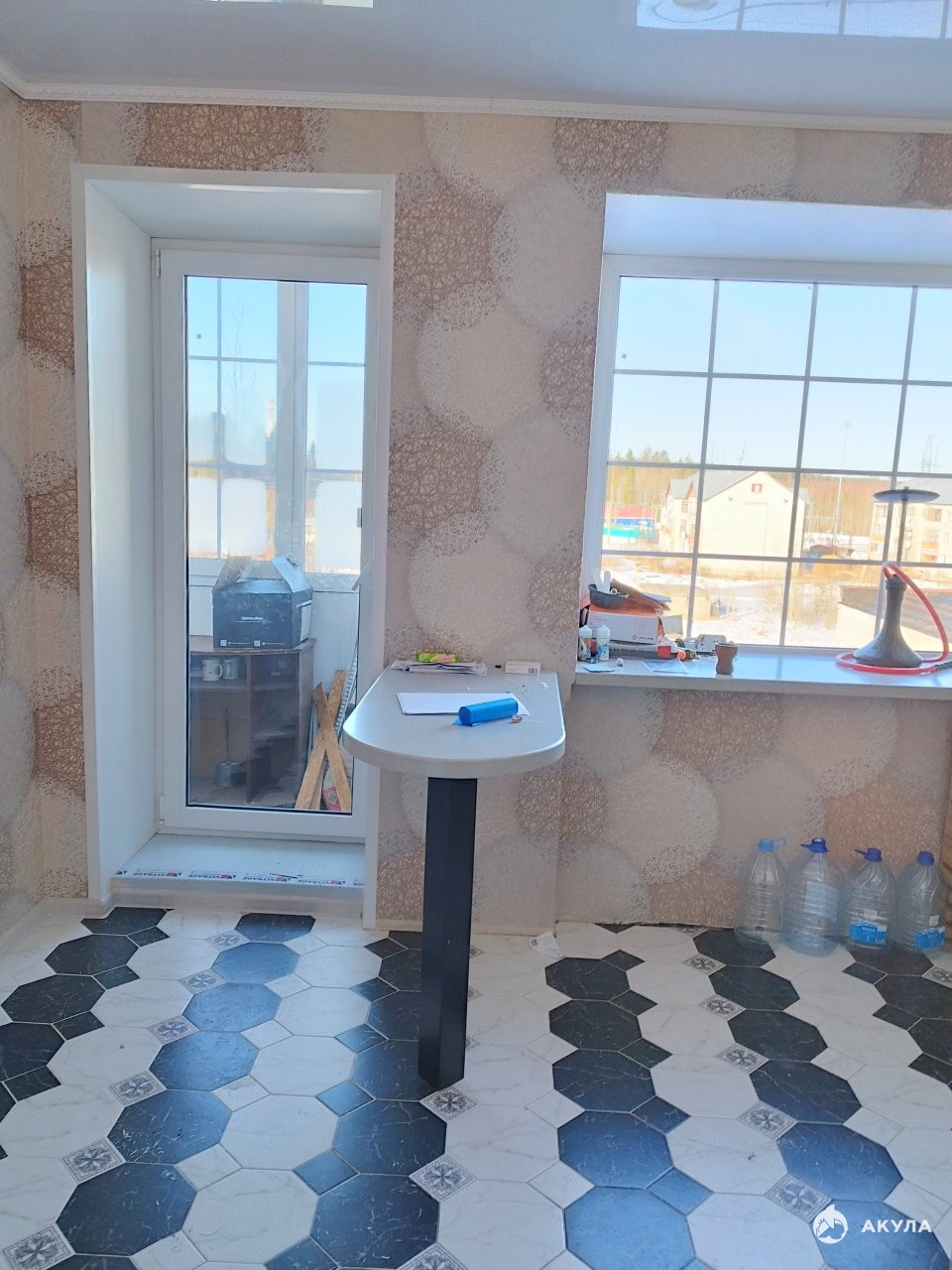 Просторная застекленная лоджия ( вдоль комнаты и кухни) открывает прекрасный вид на лес.